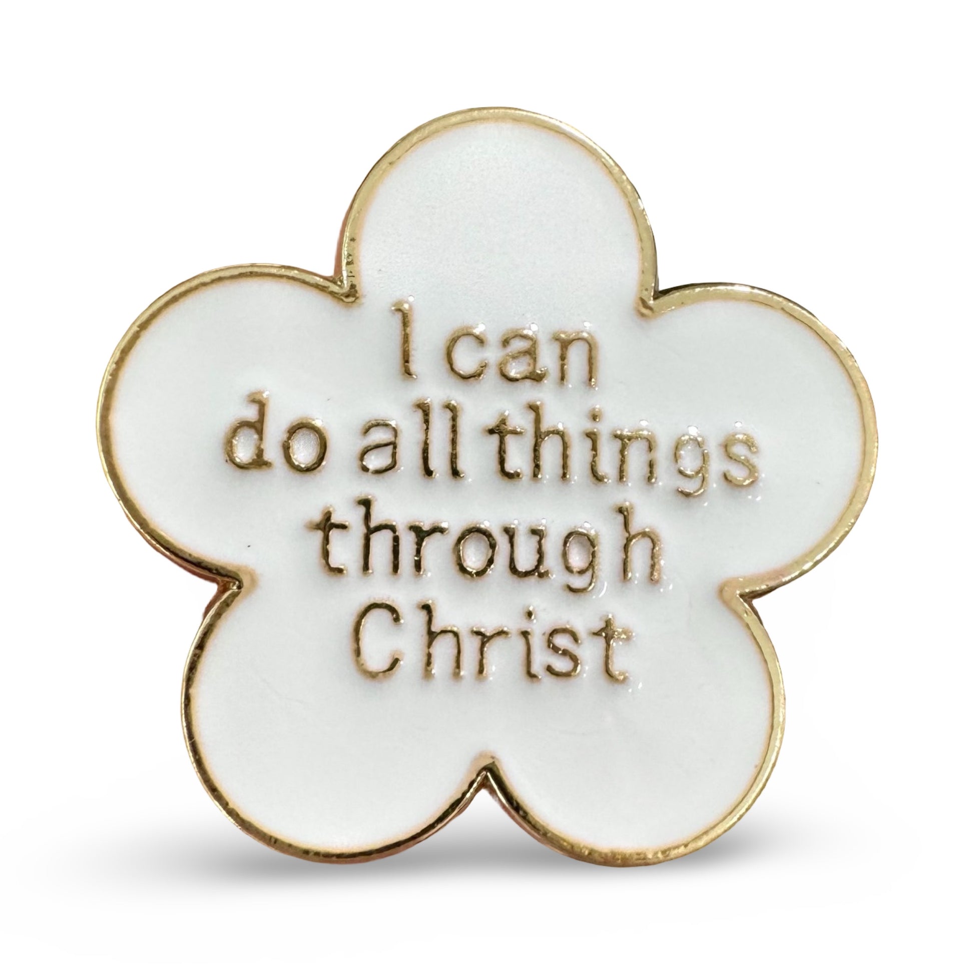 This flower pin, containing The Bible verse, I can do all things through Christ , is stylish and beautiful, and will make a great addition to your backpack, bag, or purse.