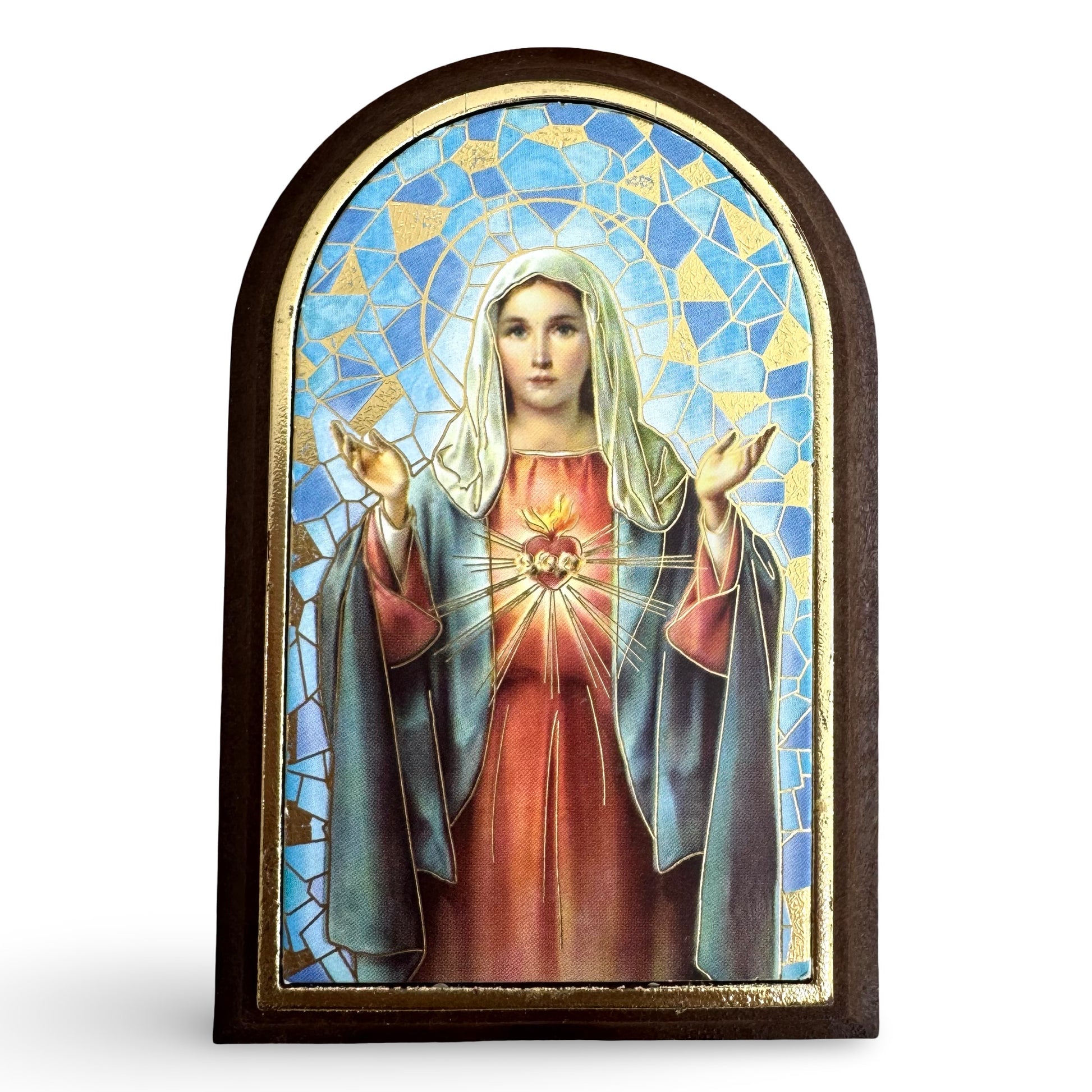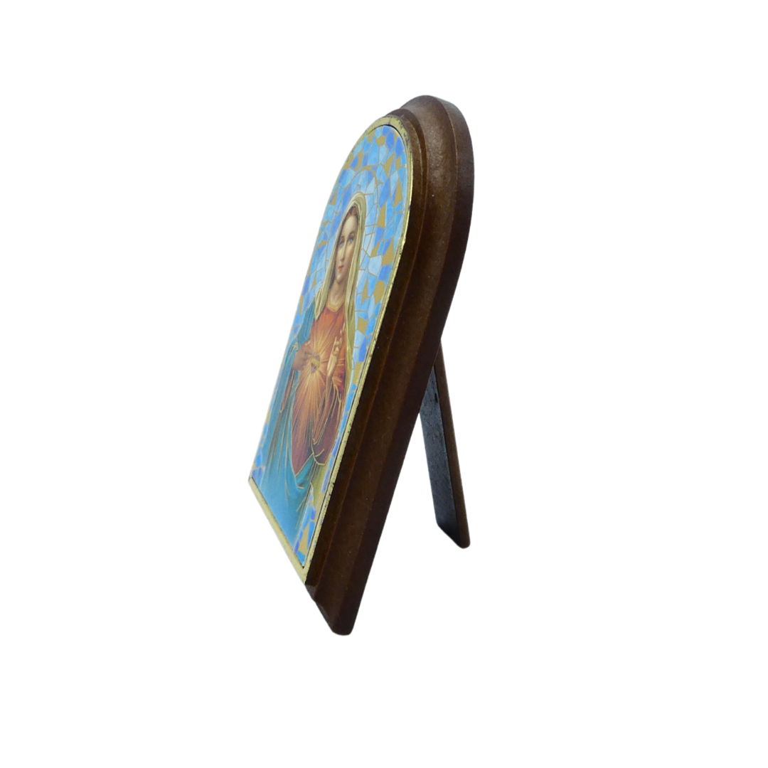 This image of the Immaculate Heart of Mary features our Blessed Mother, Mary, with Her Immaculate and Pierced Heart radiating forth with love for humanity. This mosaic-style standing image is a perfect addition to a prayer space or to a night stand. Console Her Heart by praying the rosary before Her Immaculate Heart!