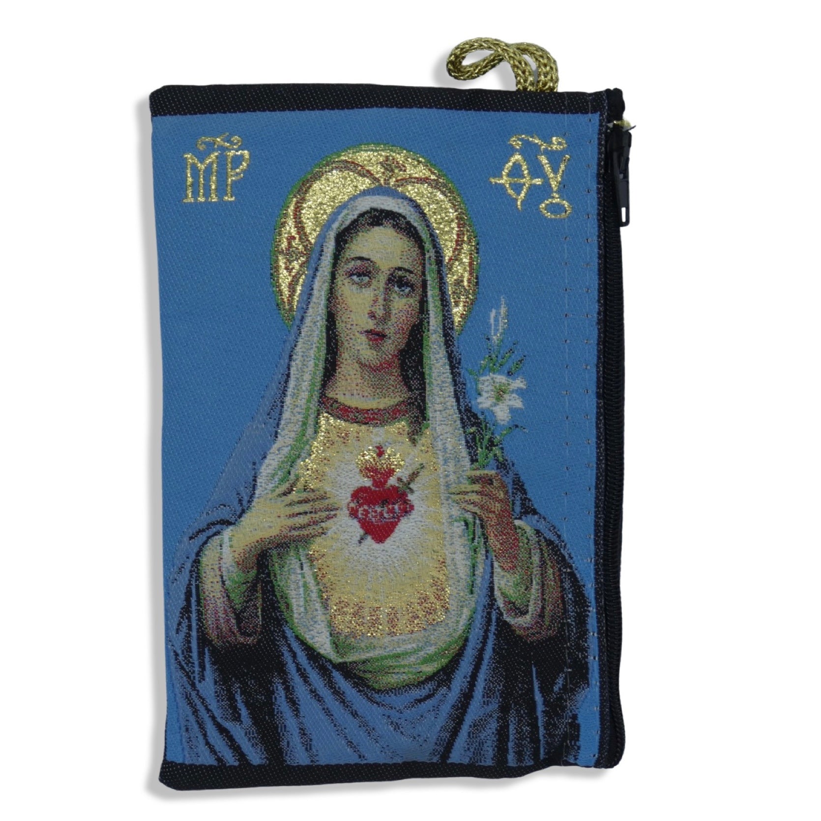This Immaculate Heart of Mary pouch is perfect for holding prayer cards, rosaries, and other small devotional items. It fits well in a purse or can be used as a small handheld wallet. It bears the image of Our Lady with her Pierced and Immaculate Heart holding a lily on a blue background.