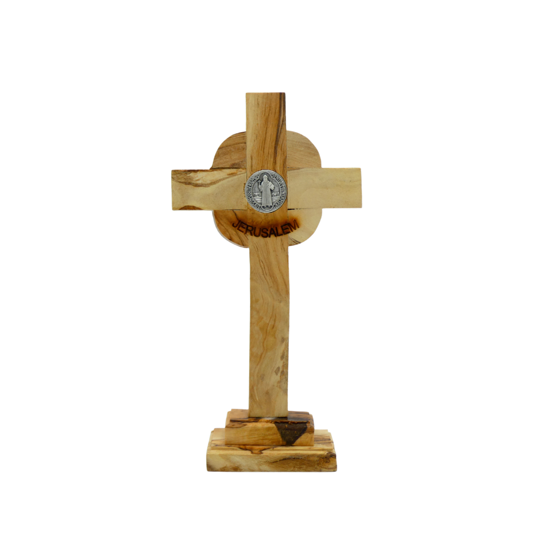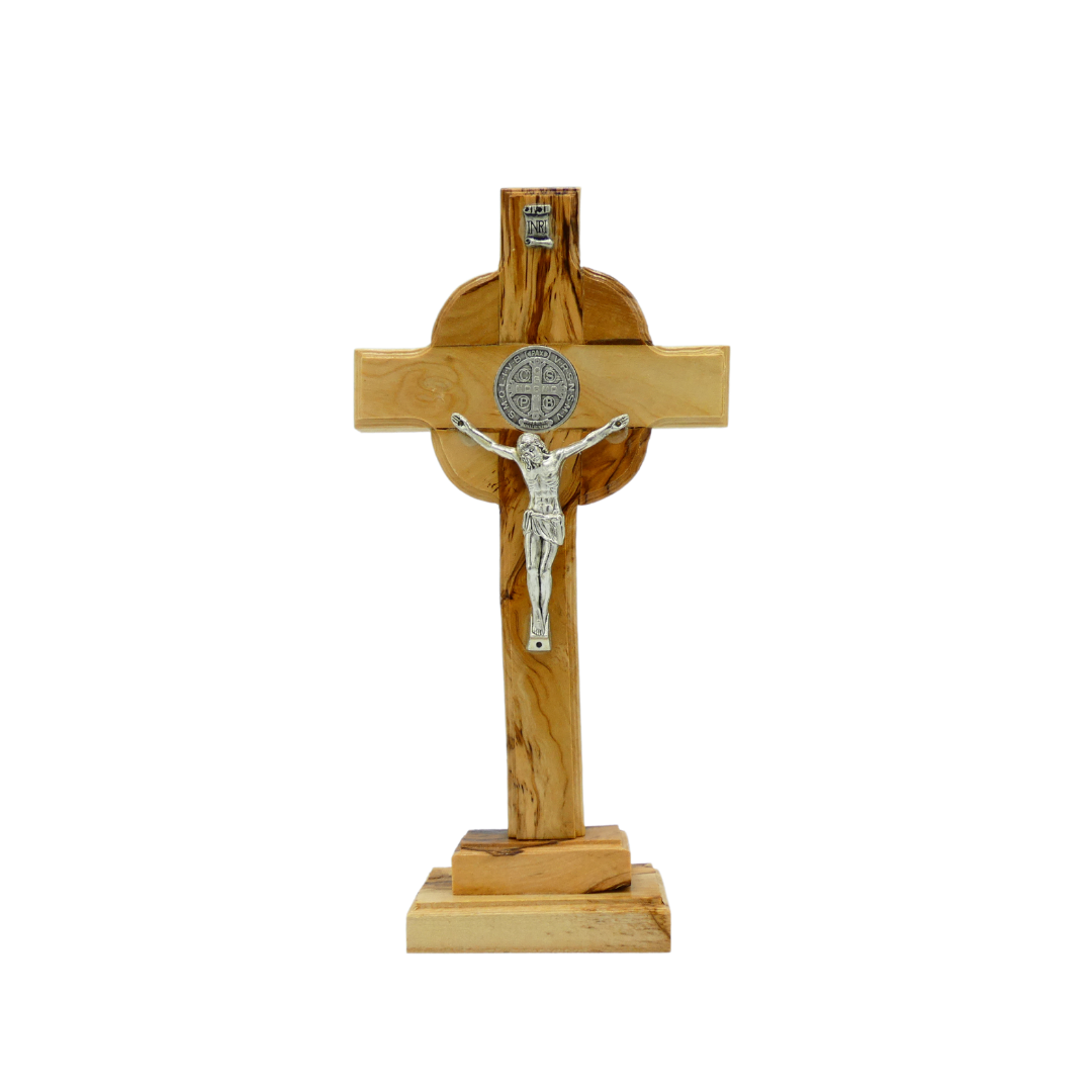 A genuine olive wood cross with beveled edges and a circular olive-wood accent behind the cross with a silver corpus, set on a rectangular wood base to stand freely on any flat surface. This crucifix comes all the way from the Holy Land and is brought by Mother Adela, Foundress SCTJM, when she leads pilgrimages. A small silver St. Benedict medal is set in the crucifix just behind the Lord's head. A powerful sacramental of the Church, the St. Benedict crucifix, when exorcized and blessed, brings a particular protection of the home where it is placed against evil as well as a particular presence of Christ himself. Available in 2 sizes, this crucifix, coming from the land where Our Lord lived and died, is perfect as a gift or for yourself to place on a desk or bookshelf to always keep Christ present in our daily lives.
