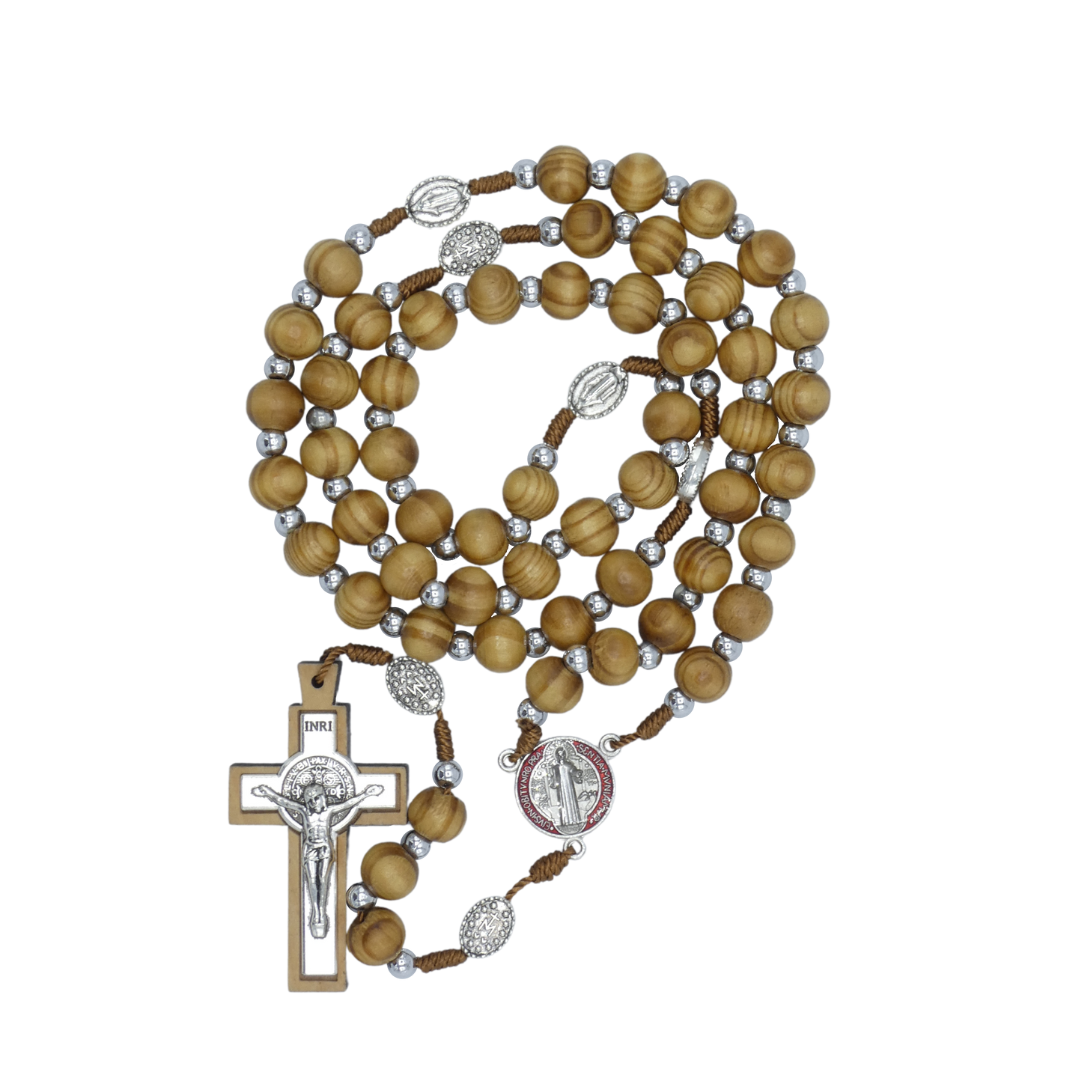 A genuine olive wood rosary with Miraculous Medals as the Our Father beads and a Saint Benedict medal as the center bead. This rosary also boasts an olive wood cross with a medal St. Benedict crucifix. This rosary comes all the way from the Holy Land and is brought by Mother Adela, Foundress SCTJM, when she leads pilgrimages. Uniting St. Benedict with the heart of Our Lady, the prayers offered from this rosary bring many graces for those praying and being prayer for. This rosary, coming from the land where Our Lord lived and died, is perfect as a gift or for yourself to offer prayers for your family, your friends, and the entire world.