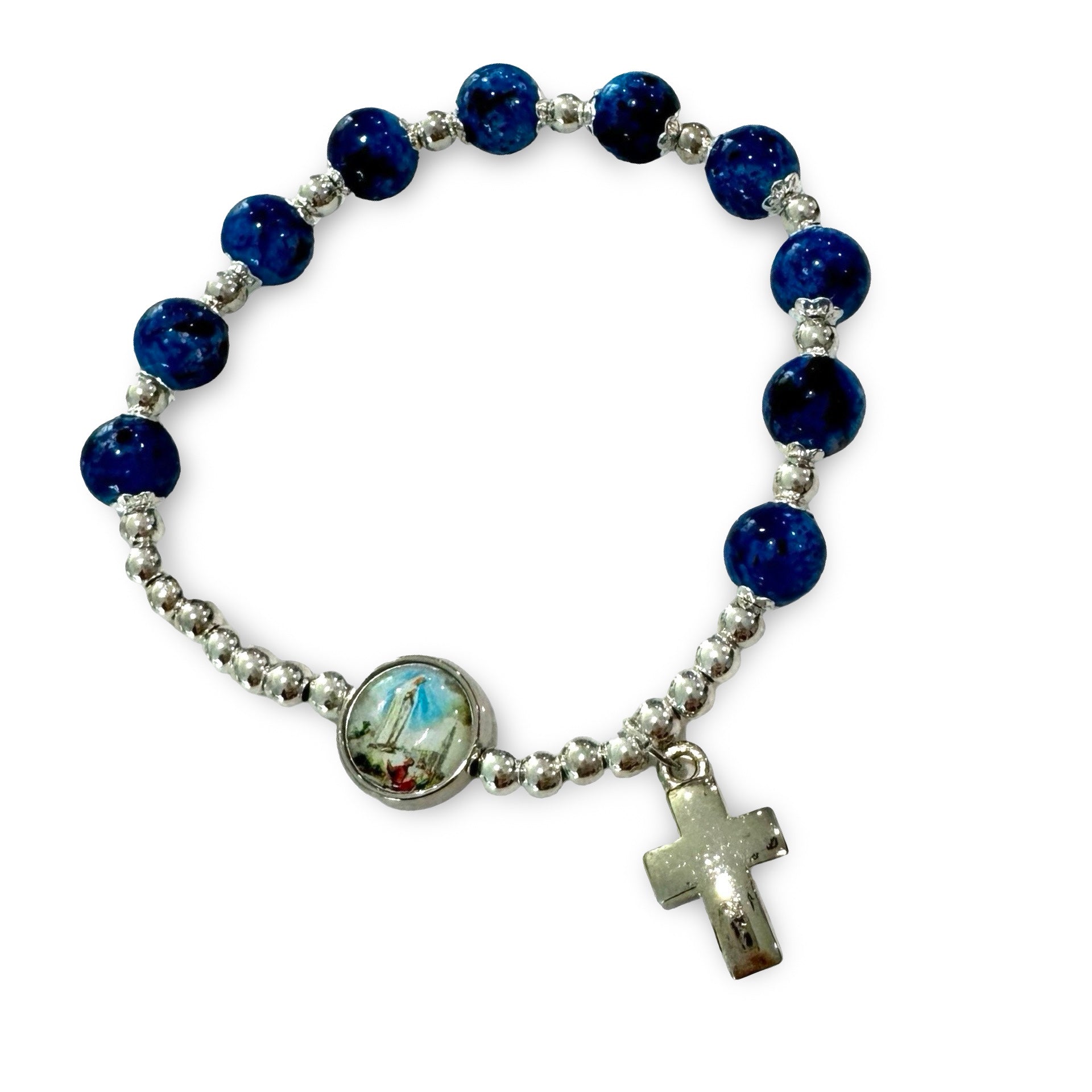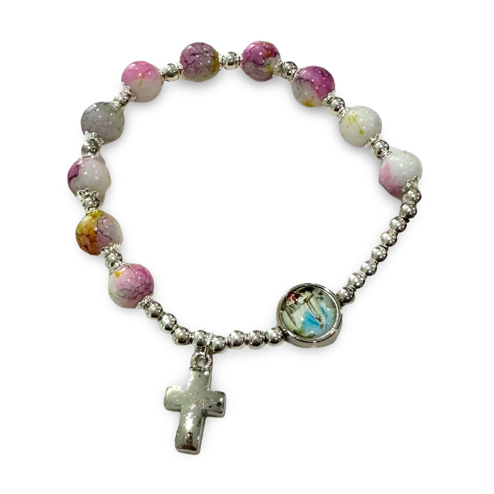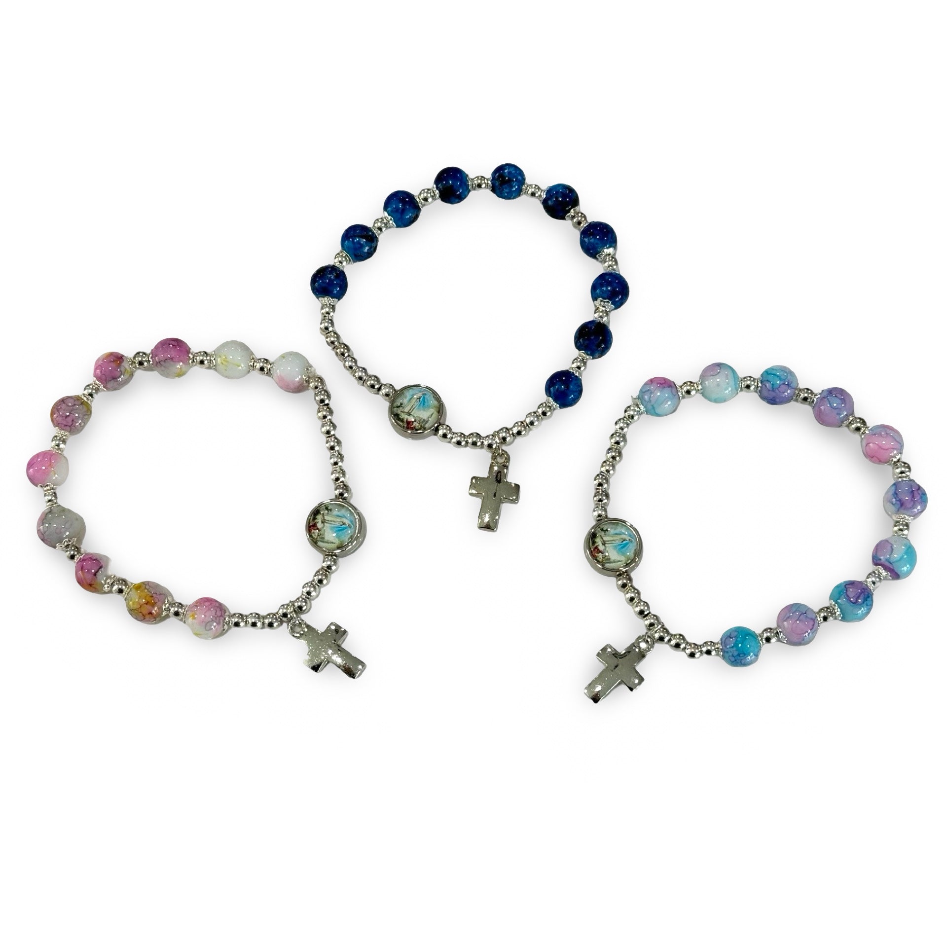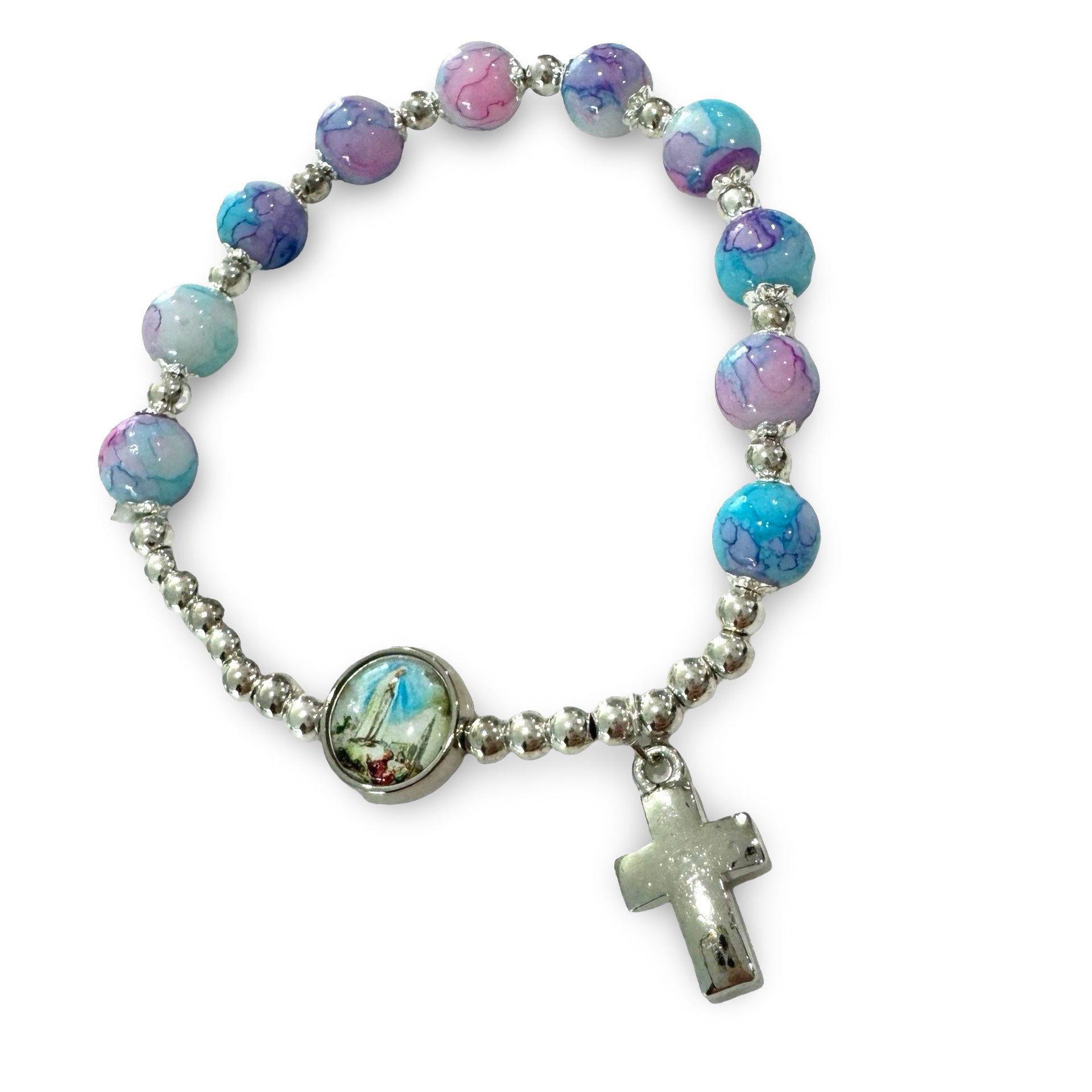 This stunning rosary bracelet features large marble beads with a colored accent medal of Our Lady of Fatima with the shepherd children and a silver cross. It is a unique and stylish way to make sure that you always have a rosary with you.