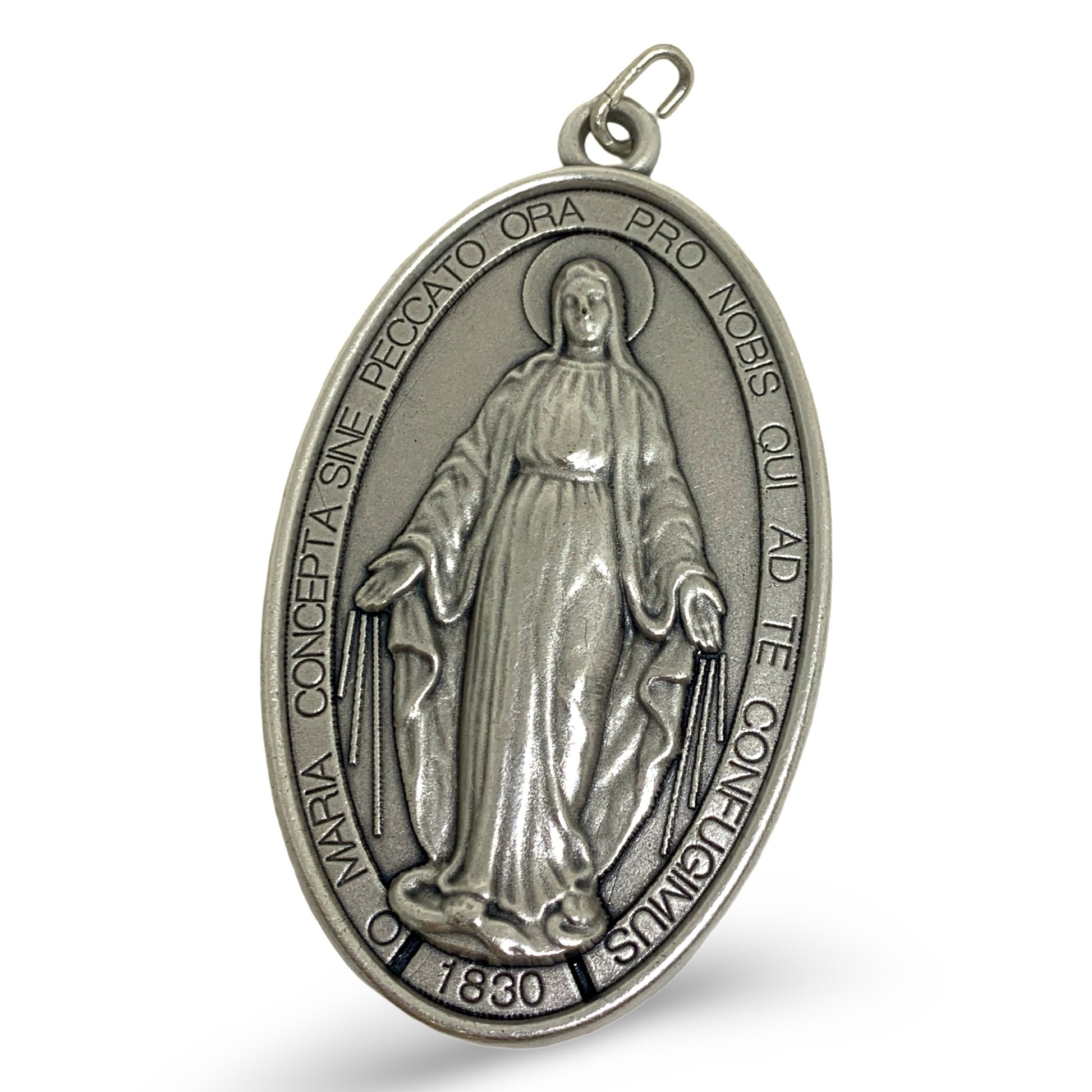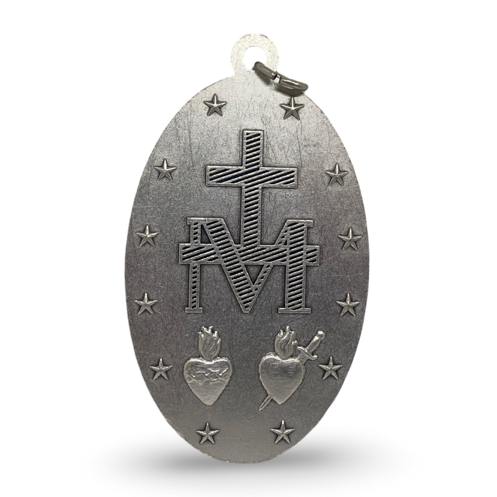 This large silver Miraculous Medal, with Latin inscription, can be creatively placed on the walls of your home, over doors, and many more places as a reminder of Our Lady's powerful and maternal protection!