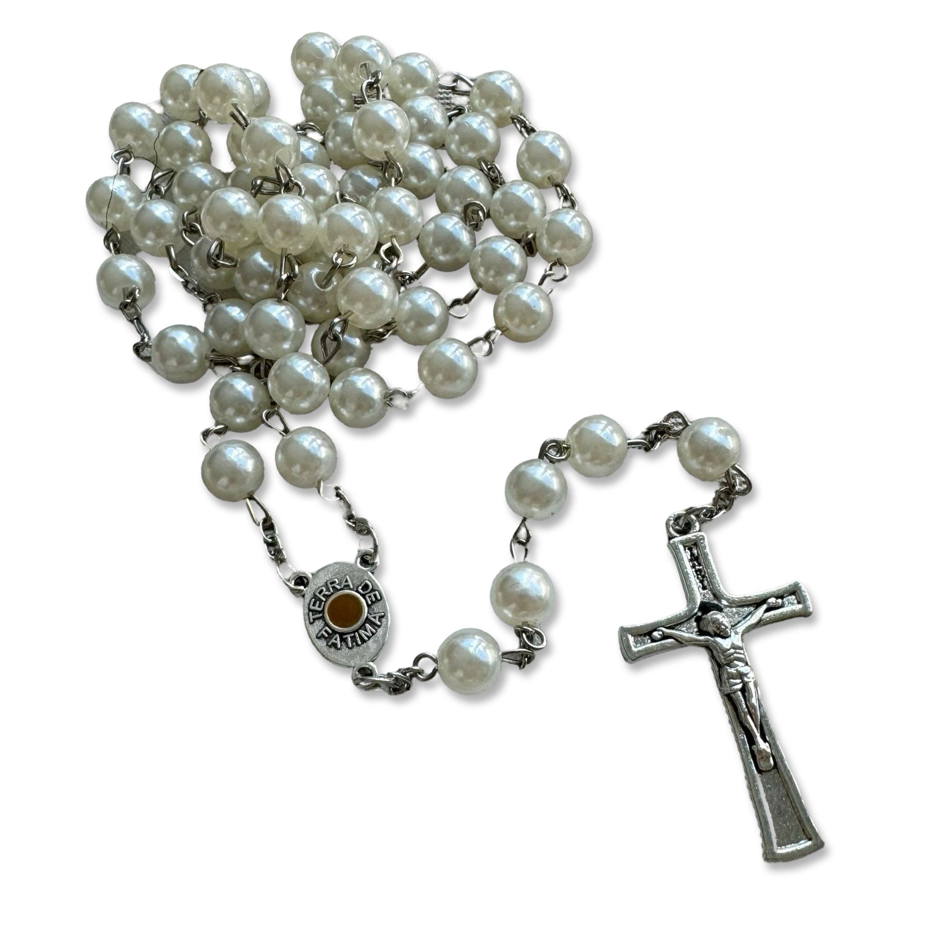 Large Pearl Fatima Rosary with Soil from Fatima in Case