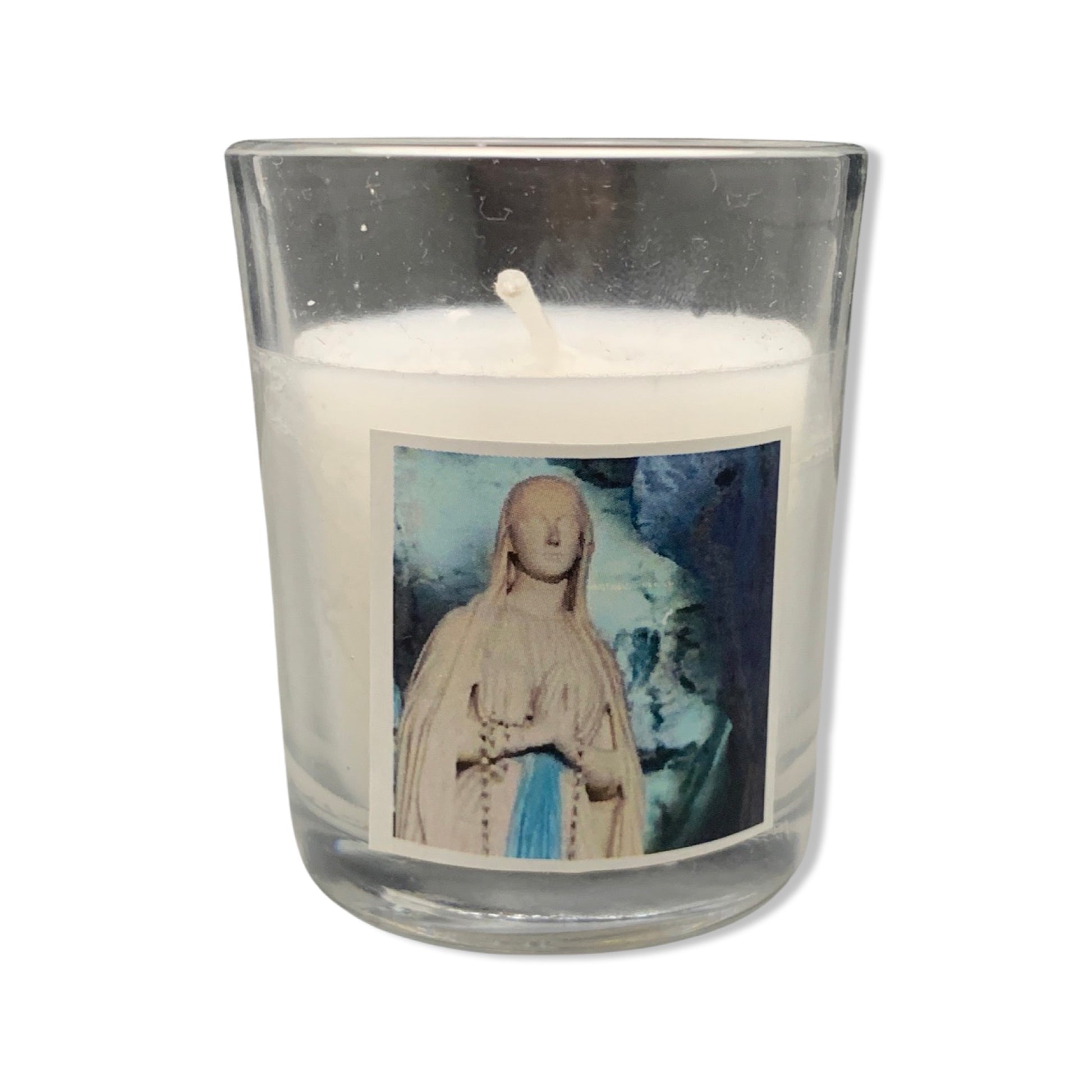 Small white votive candle in a clear glass holder with an image of Our Lady of Lourdes. This candle is perfect to place before an image of Our Lady or to light at home, asking Our Lady to intercede for particular intentions.