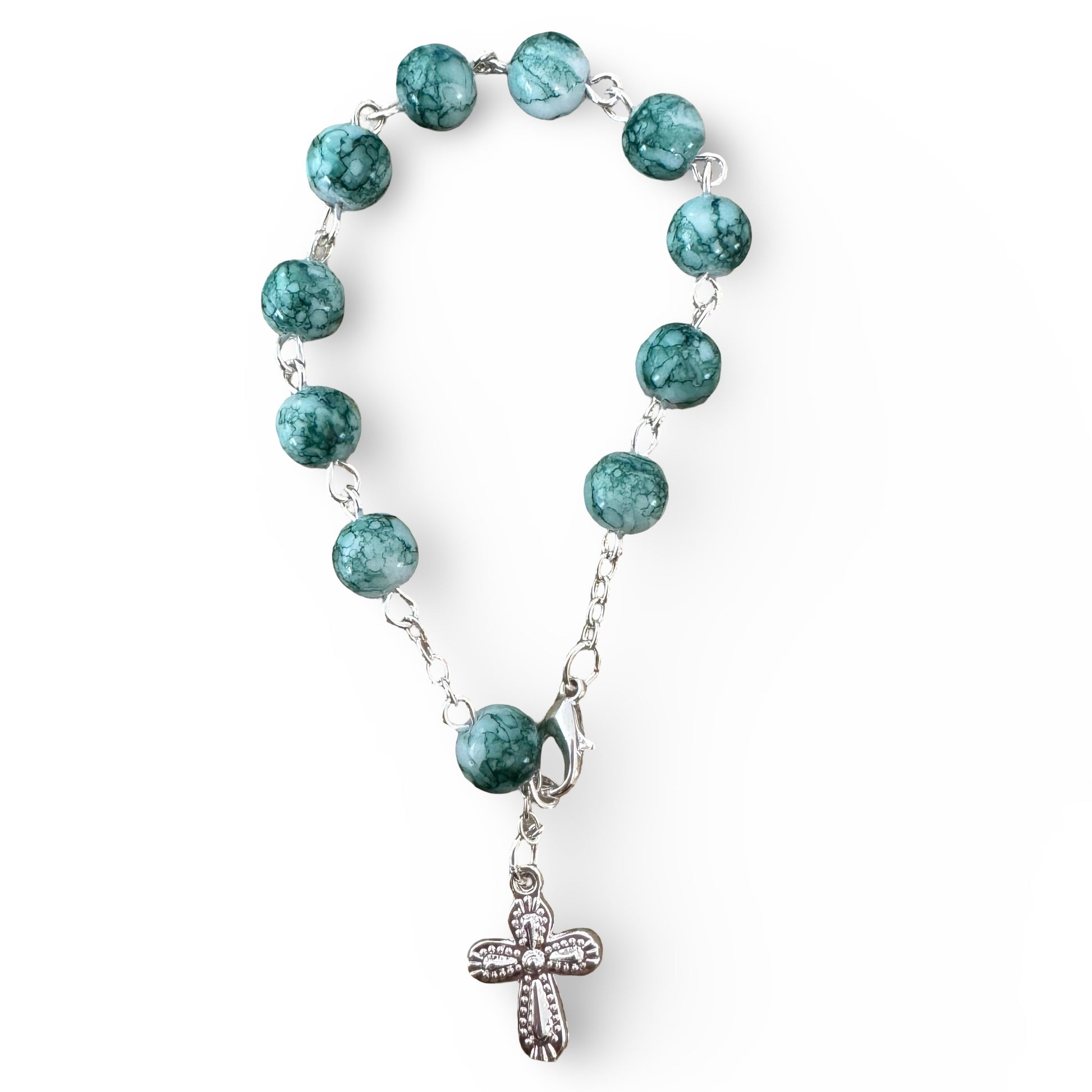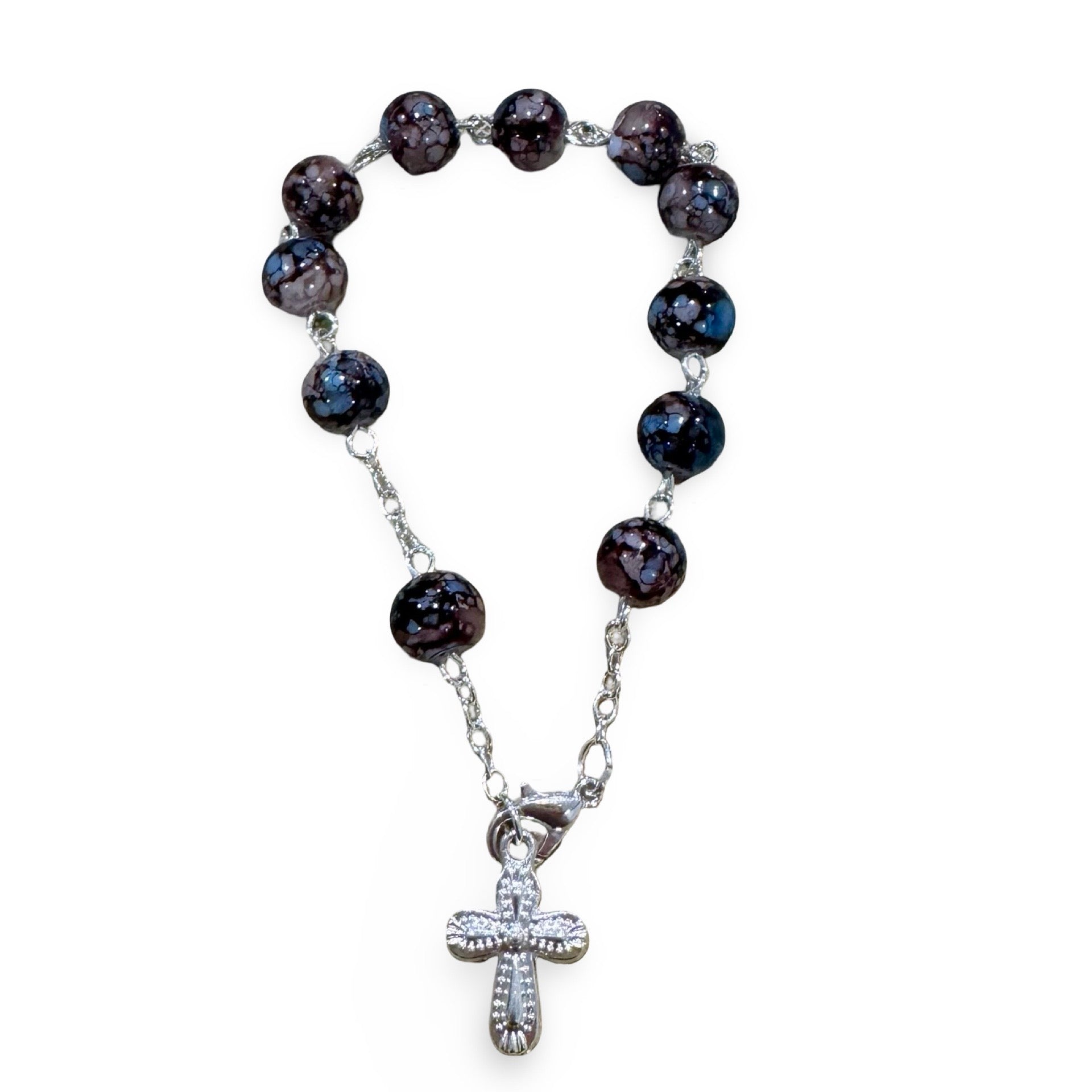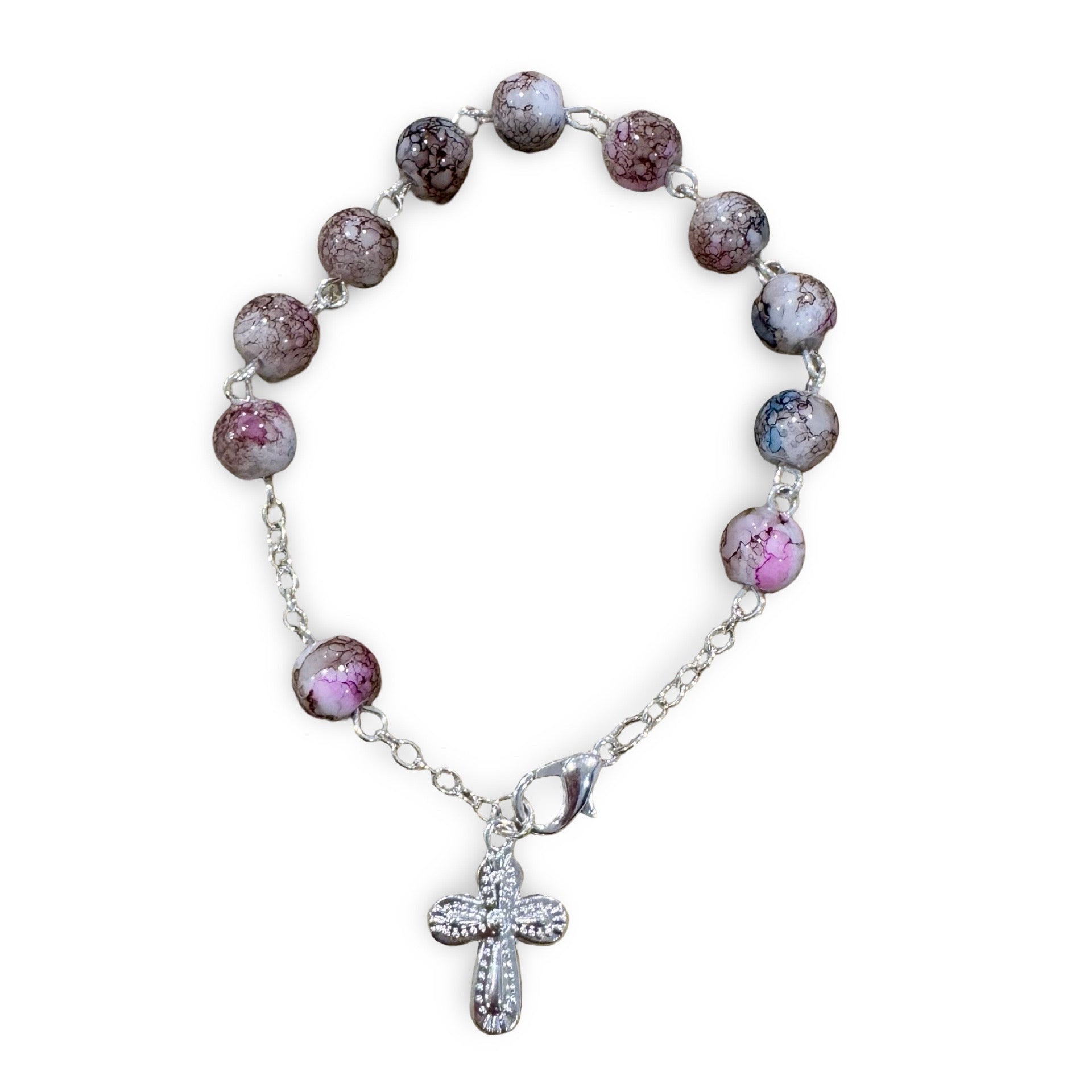 This delicate marble bracelet of assorted colors closes with a silver clasp and features a dangling cross. It is brought with love from Fatima, Portugal by our Mother Foundress, Mother Adela Galindo.