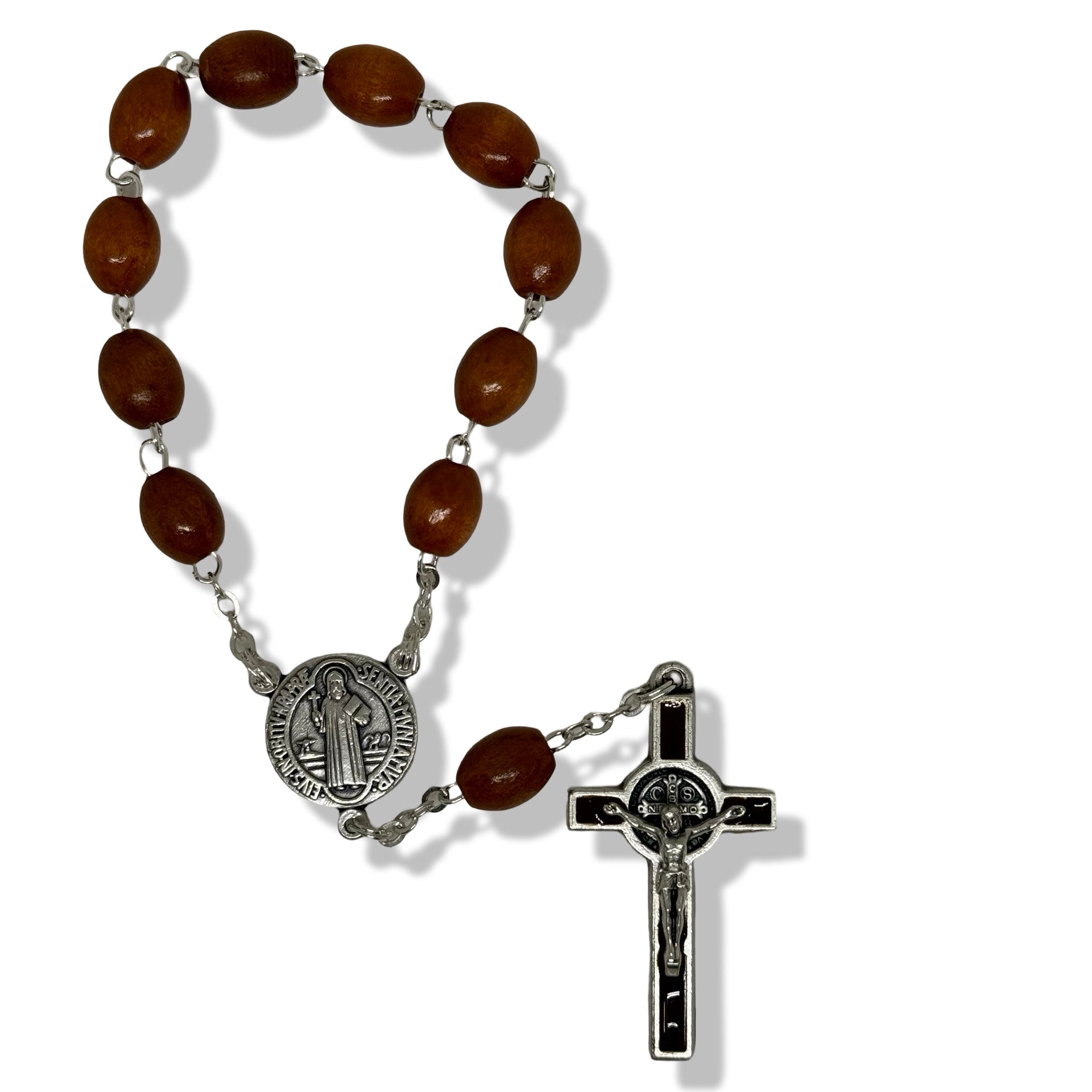 This wooden decade rosary is joined in the center by the medal of St. Benedict. It also features a detailed silver and brown crucifix. It was brought with love by our Mother Foundress and Sisters on pilgrimage from Lourdes, France.