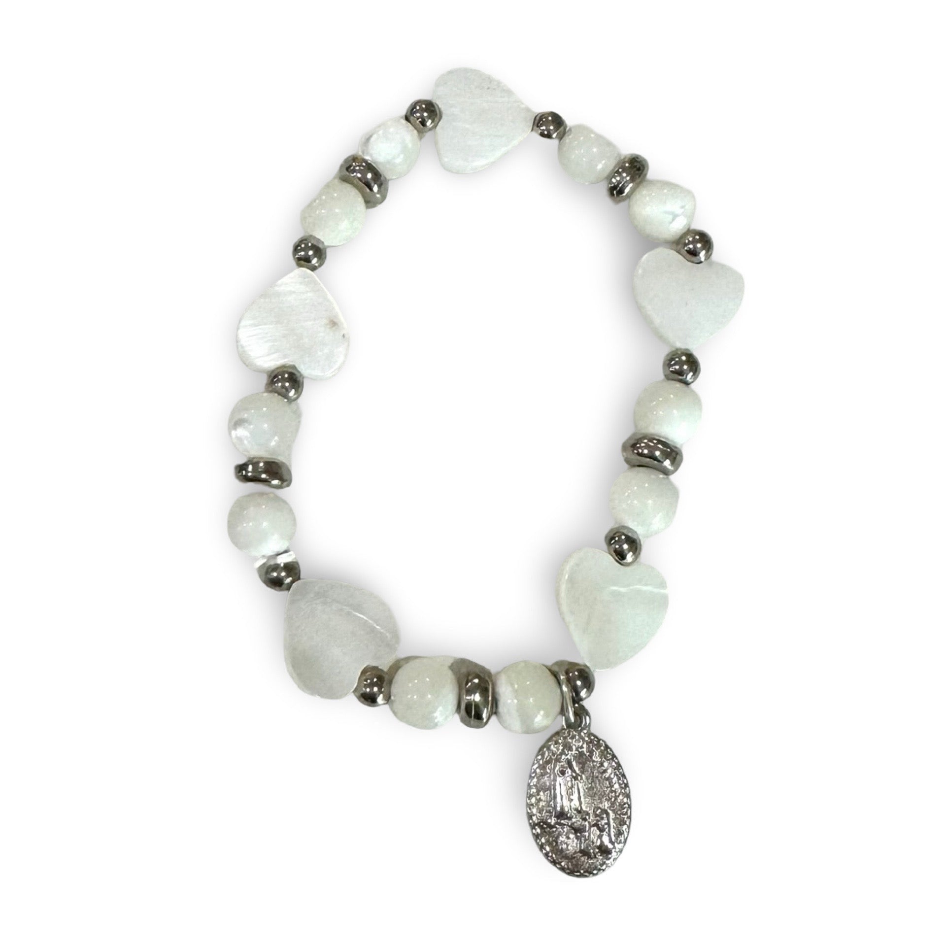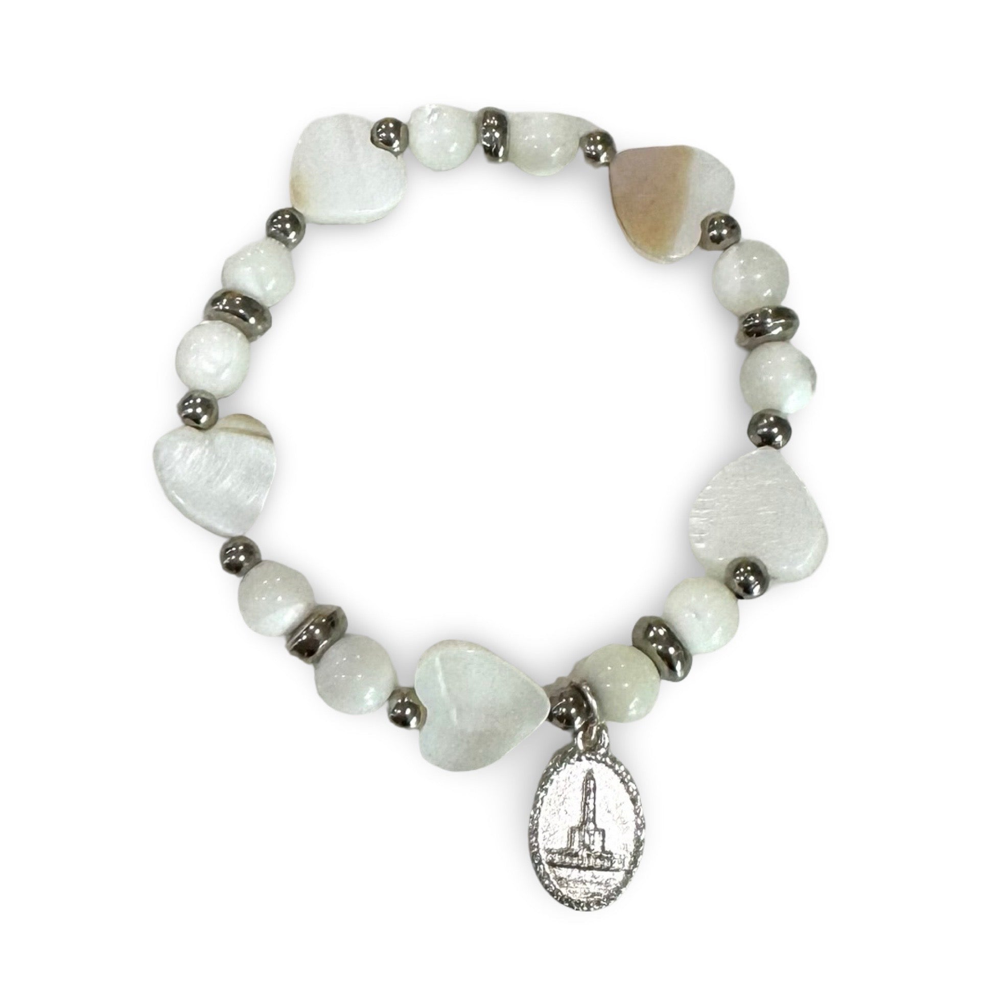 This exquisite bracelet features both heart-shaped and round mother-of-pearl beads, silver spacers, and finished with a delicate medal of Our Lady of Fatima.