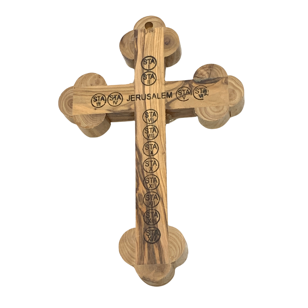 An olive wood crucifix with a silver corpus from the Holy Land. The beams of the cross are accented with budded (trefoil) ends which contain soil, flowers, and two kinds of incense from the Holy Land. This is a crucifix that can make present the place where Jesus lived and died and where the Church was born. It is a perfect remembrance from a pilgrimage to the Holy Land or for those unable to make the pilgrimage, brings a piece of that Holy Land home. It is brought from the Holy Land by Mother Adela, Foundress SCTJM, when she returns from the pilgrimages she leads there.