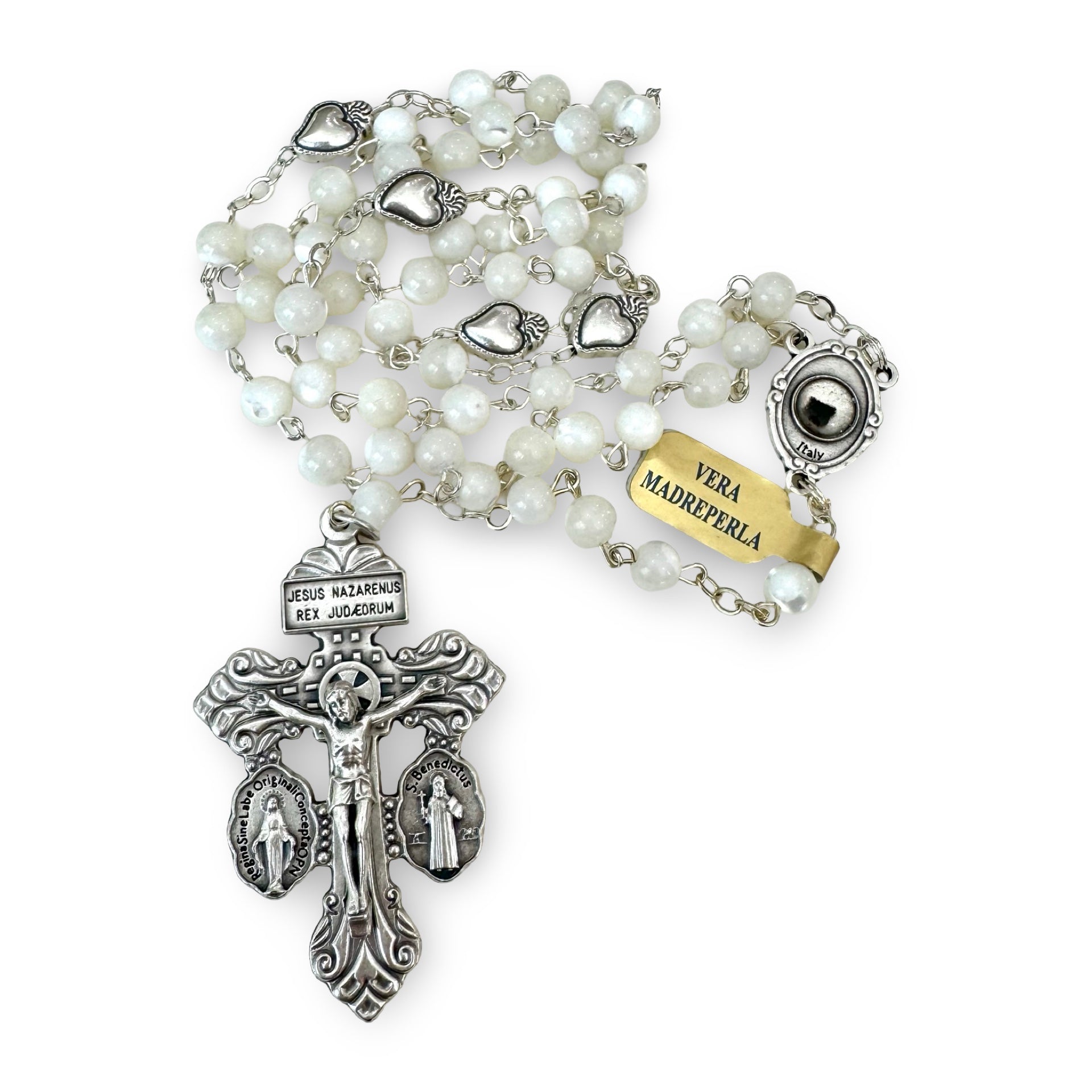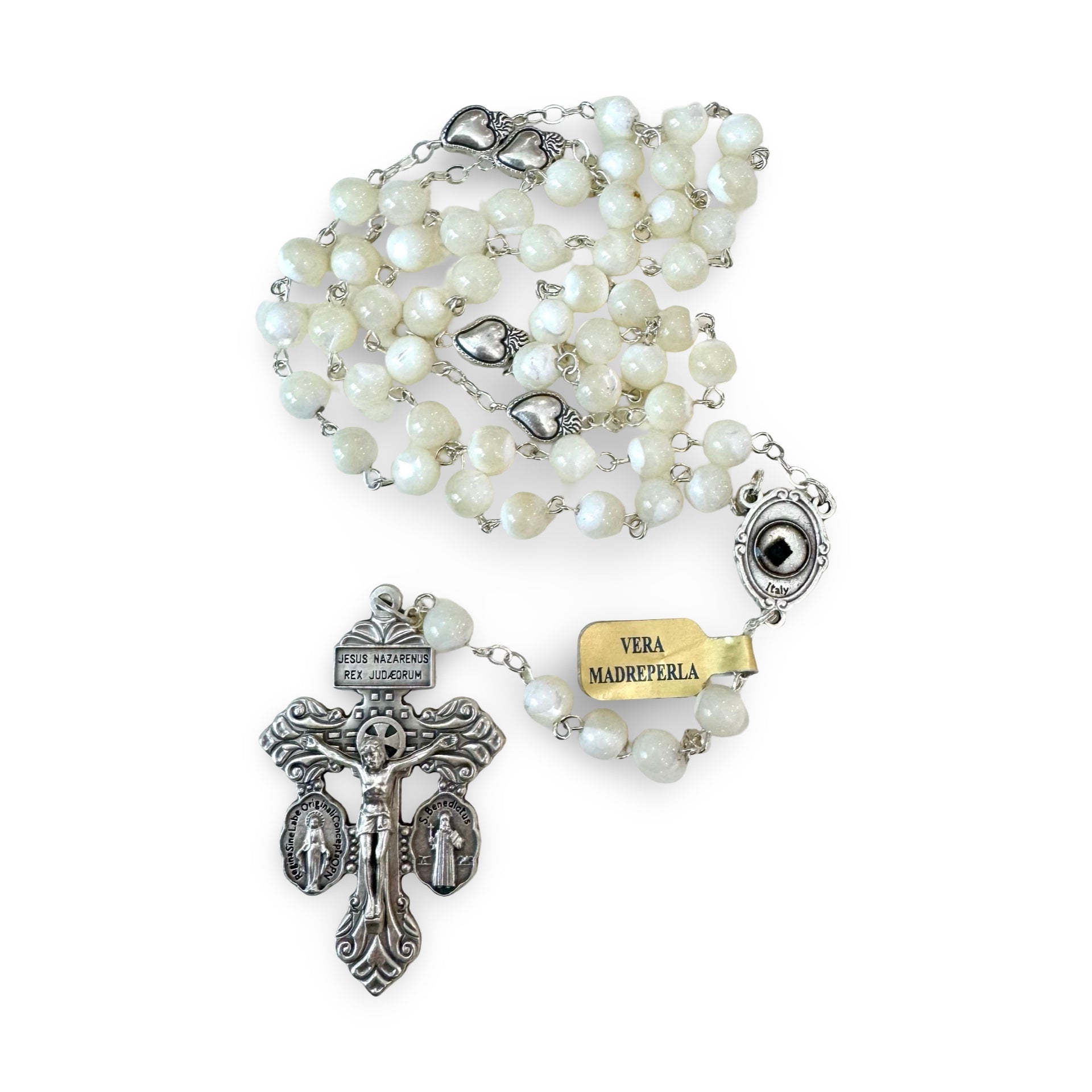 This genuine mother of pearl rosary has heart shaped Our Father Beads and a relic medal of Padre Pio with a pardon crucifix. It is beautiful and delicate, while powerful with the pardon crucifix and relic of this great saint.