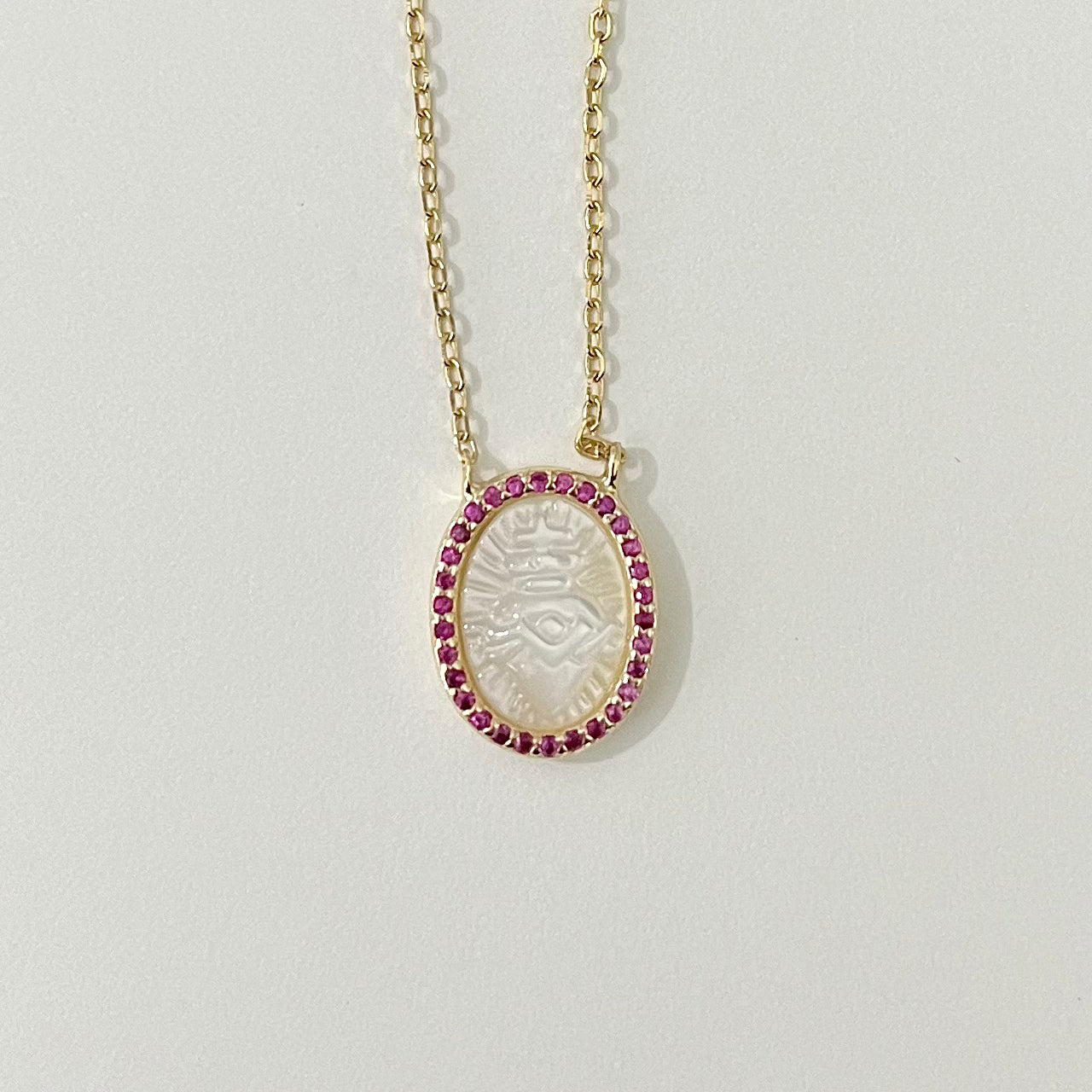 This elegant Sacred Heart necklace is composed of Mother Pearl on a 925 Silver base, bathed in either Rhodium or in 14 karat gold with a burgundy zirconium border. Mother of Pearl is the name commonly referring to the nacre that coats a pearl. It is a mixture of minerals secreted by oysters that forms the gem.