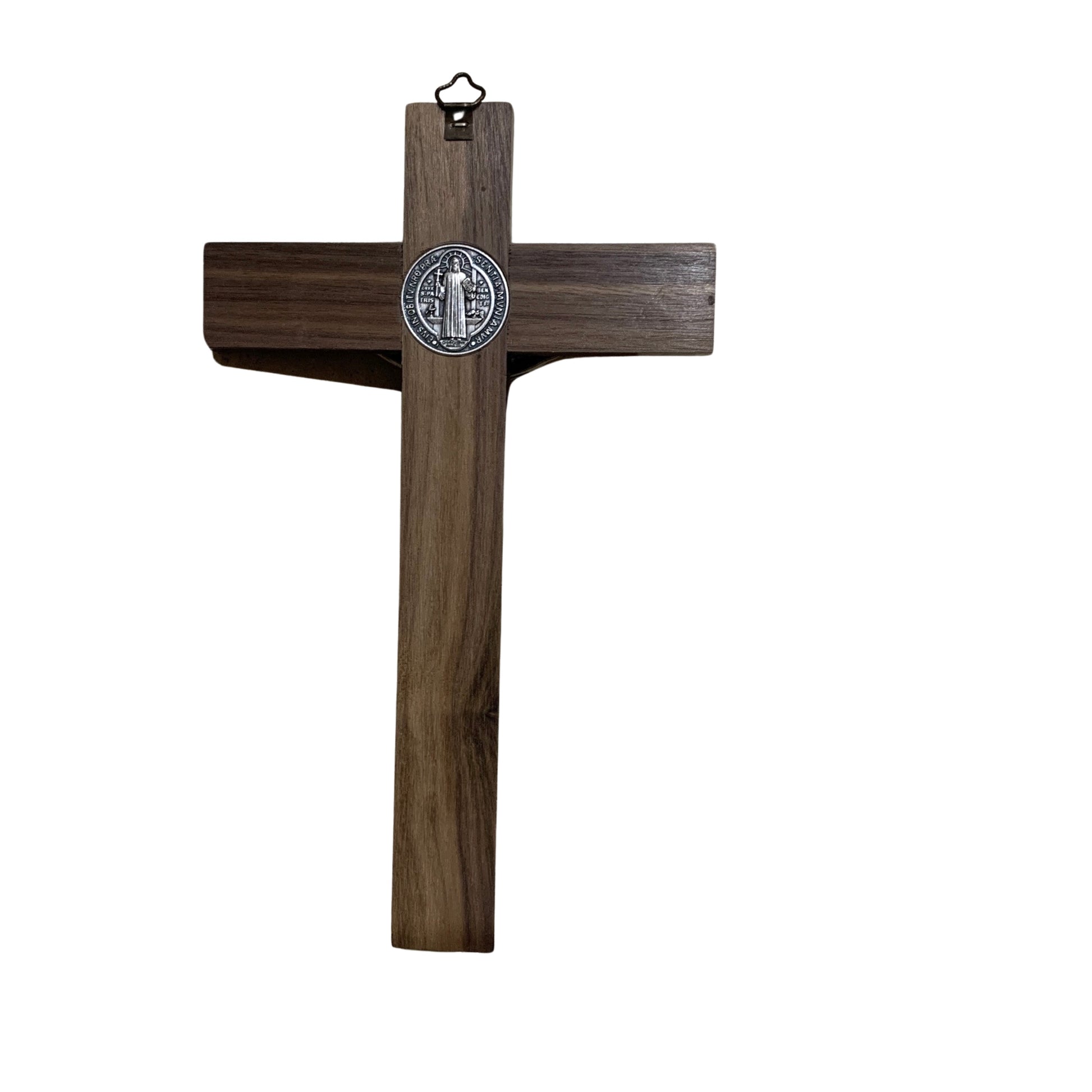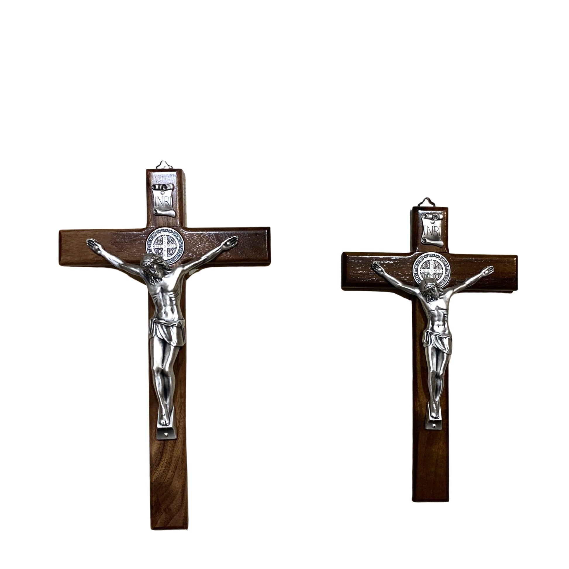 A natural brown stained wood cross and a silver corpus. A silver St. Benedict medal is set where the crossbeams meet. A powerful sacramental of the Church, the St. Benedict crucifix, when exorcized and blessed, brings a particular protection of the home where it is placed against evil as well as a particular presence of Christ himself. Available in two sizes, this crucifix can find a home in any room or office, protecting the room or office and those who use it and evangelizing those who visit. These crucifixes are purchased for our shop and brought from Rome by Mother Adela Galindo, SCTJM - Foundress.