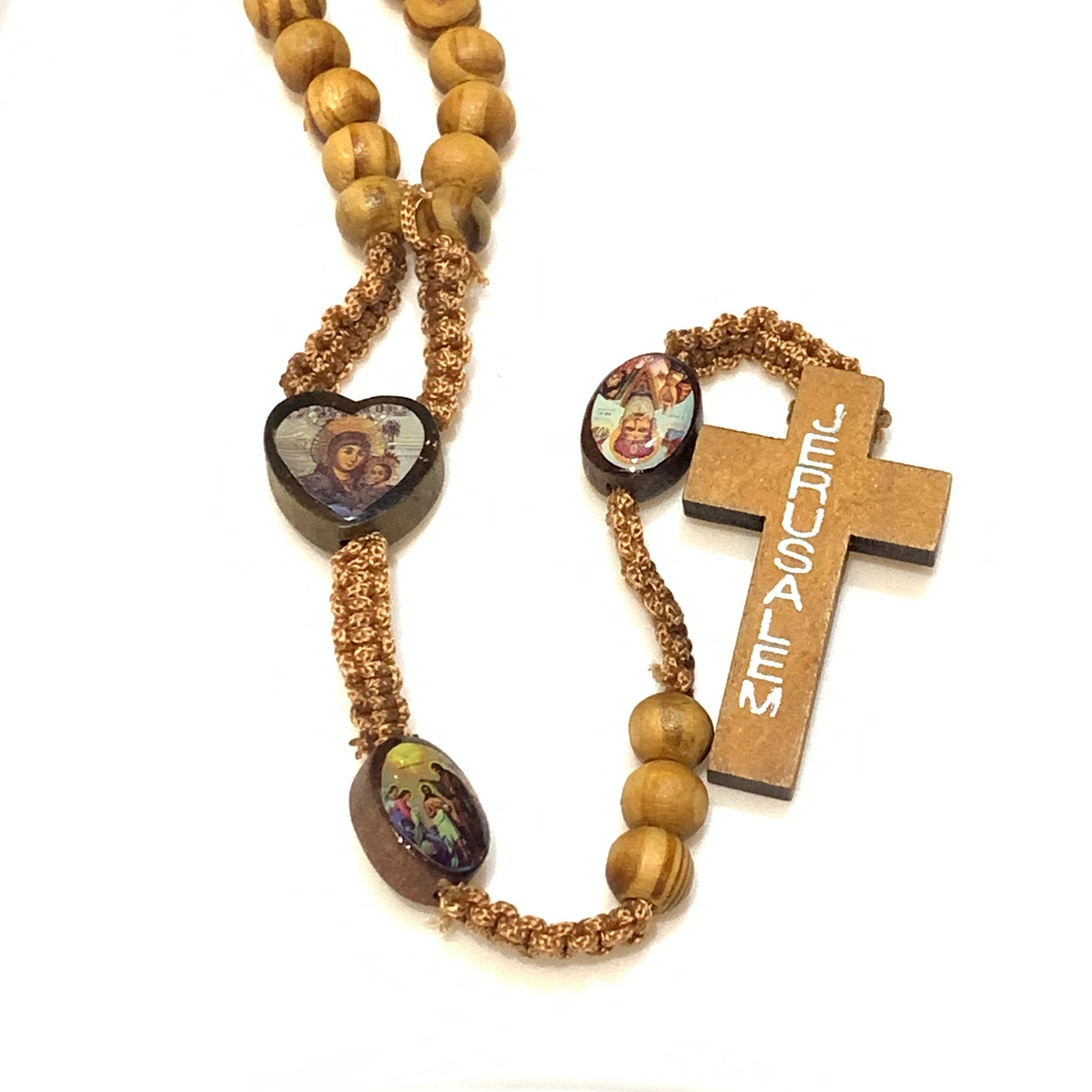 A genuine olive wood rosary with metal links includes various Saint Medals as the Our Father beads and an Our Lady of Tenderness medal with soil from the Holy Land as the center bead. This rosary comes all the way from the Holy Land and is brought by Mother Adela, Foundress SCTJM, when she leads pilgrimages. This rosary, coming from the land where Our Lord lived and died, is available in various sizes and with different crucifixes. It is perfect as a gift or for yourself to offer prayers for your family, your friends, and the entire world.