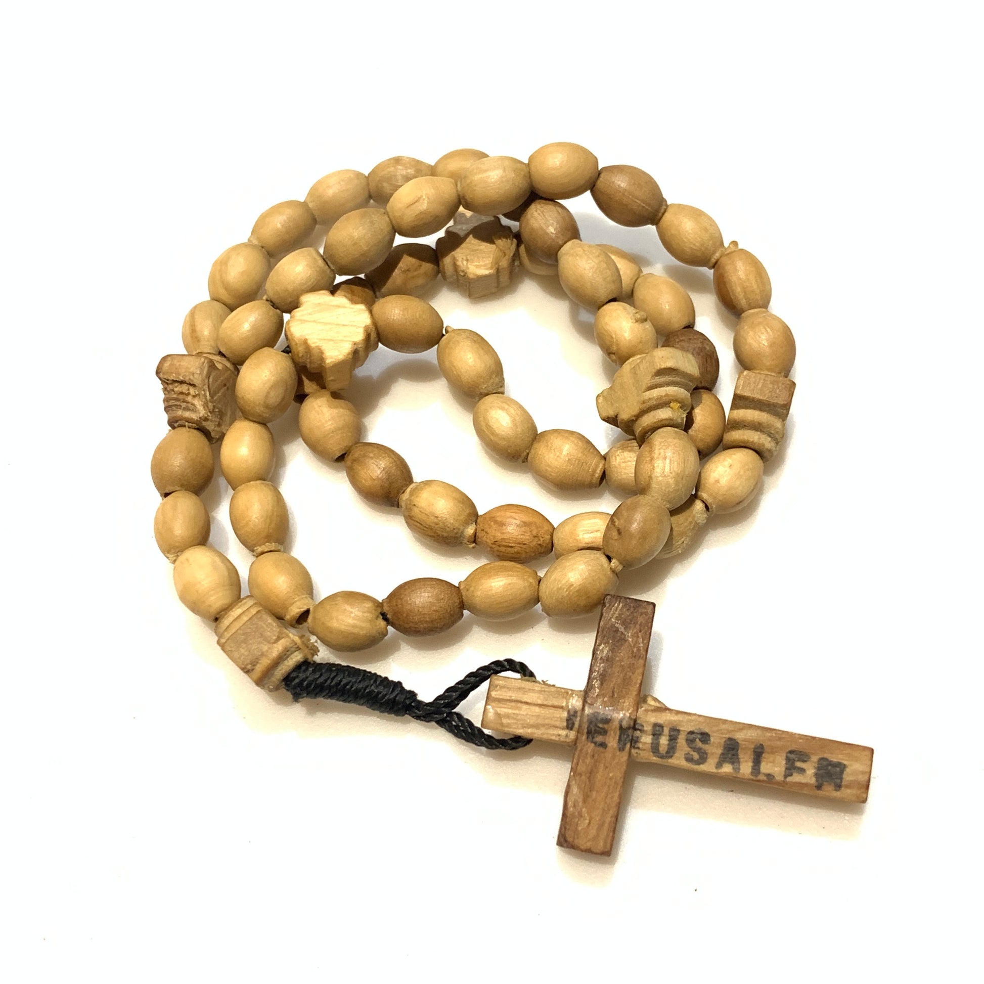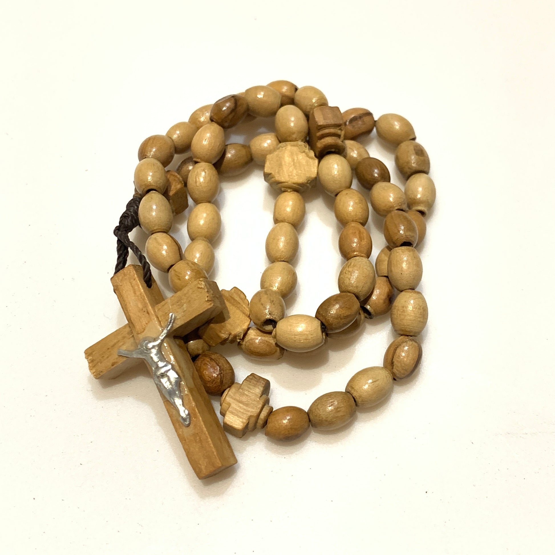 A genuine olive wood rosary on string with a simple cross marked "Bethlehem" and is available in two lengths. This rosary, brought by Mother Adela, Foundress SCTJM, when she leads pilgrimages, comes from the Holy Land where Our Lord lived and died, and is perfect as a gift or for yourself to offer prayers for your family, your friends, and the entire world.