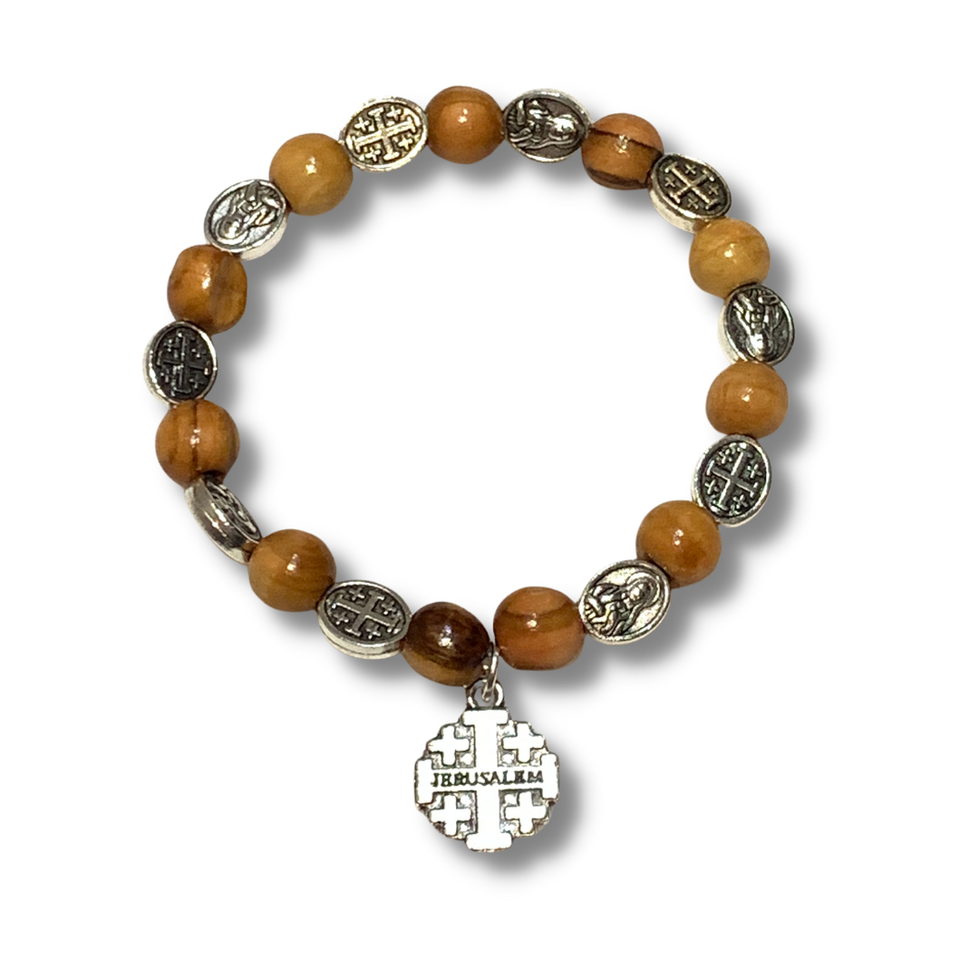 A genuine olive wood bracelet with a round Jerusalem Cross medal and small beads with the Jerusalem Cross and the Immaculate Heart of Mary on an elastic string. The Jerusalem cross represents the universality of the Church and is also seen as a symbol of Christ's command to spread the gospel to the four corners of the world. This bracelet comes all the way from the Holy Land and is brought by Mother Adela, Foundress SCTJM, when she leads pilgrimages. This bracelet, coming from the land where Our Lord lived and died, is perfect as a gift for a friend or someone receiving them sacraments or for yourself as a simple statement piece.