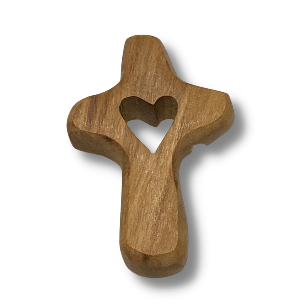 This small wooden prayer cross is made of olive wood and has a cutout of a heart and comes from the land where Our Lord lived and died. It is perfect as a gift or for yourself to hold and draw strength from the Lord. With its smaller size, this cross is ideal for traveling or for keeping in a purse or your car to always keep Christ present in our daily lives. This cross includes a Holy Card which includes pieces of wood from Gethsemane and flower petals from the Holy Land and comes all the way from the Holy Land and is brought by Mother Adela, Foundress SCTJM, when she leads pilgrimages.