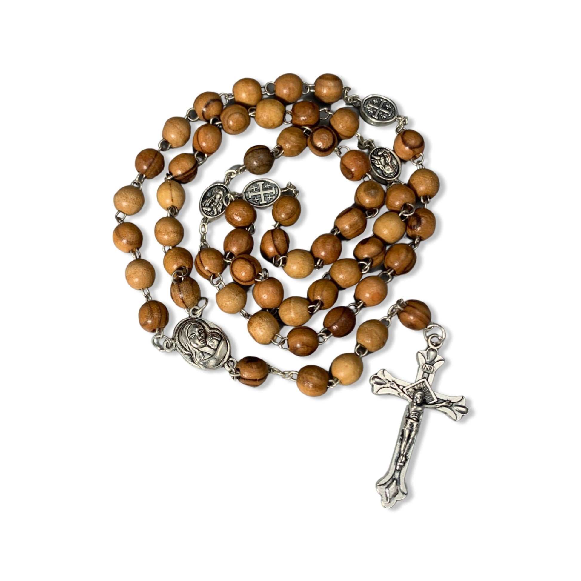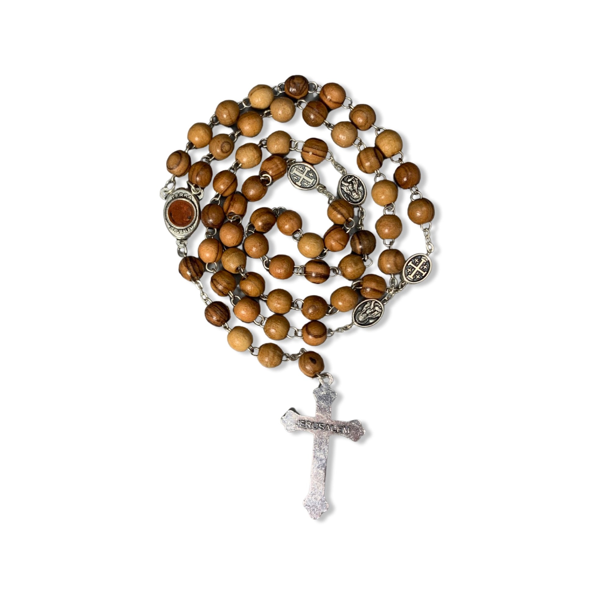 A genuine olive wood rosary with Jerusalem Cross and Immaculate Heart Medals as the Our Father beads and an Immaculate Heart medal with soil from the Holy Land as the center bead. This rosary comes all the way from the Holy Land and is brought by Mother Adela, Foundress SCTJM, when she leads pilgrimages. This rosary, coming from the land where Our Lord lived and died, is available in two different sizes and is perfect as a gift or for yourself to offer prayers for your family, your friends, and the entire world.