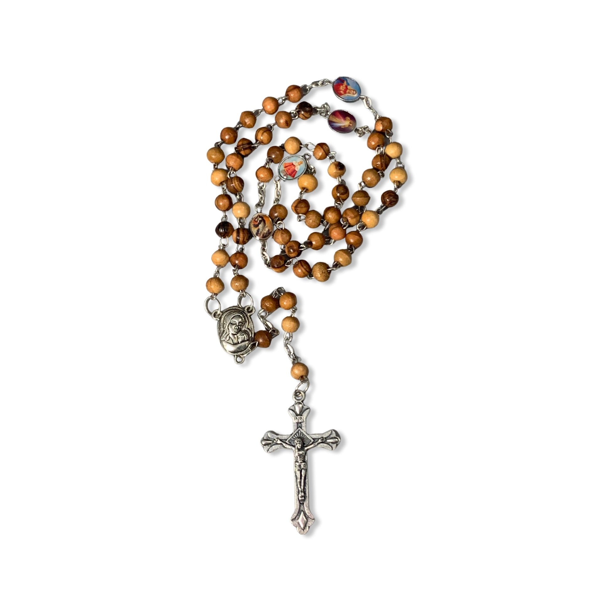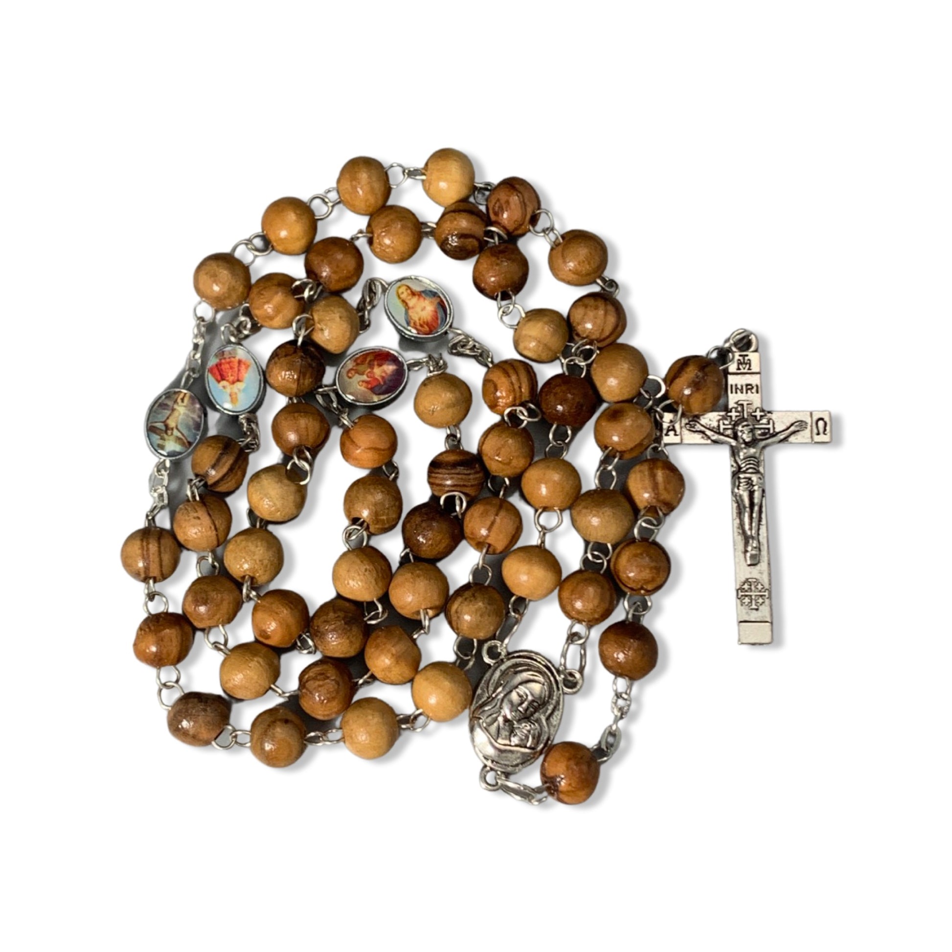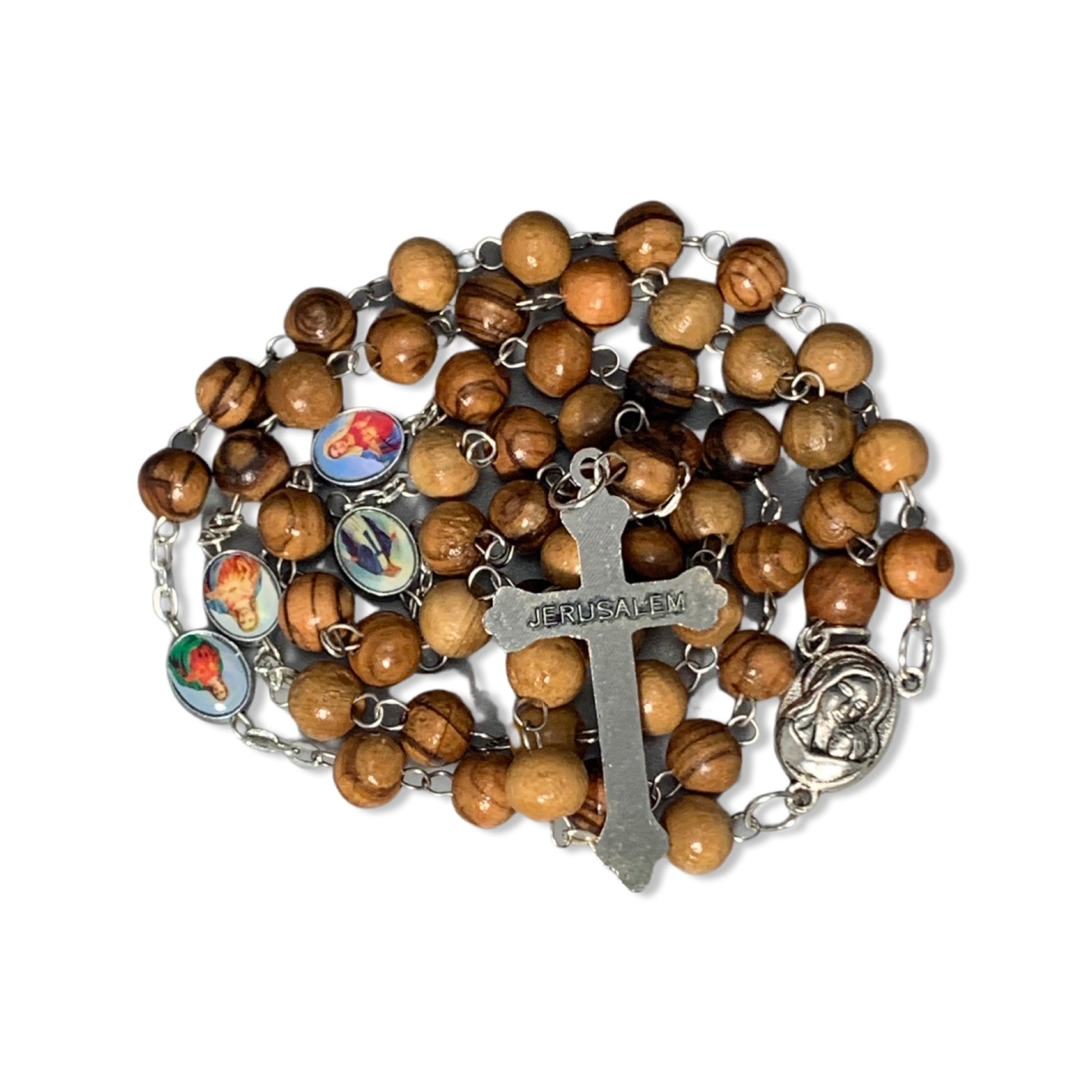 A genuine olive wood rosary with metal links includes various Saint Medals as the Our Father beads and an Our Lady of Tenderness medal with soil from the Holy Land as the center bead. This rosary comes all the way from the Holy Land and is brought by Mother Adela, Foundress SCTJM, when she leads pilgrimages. This rosary, coming from the land where Our Lord lived and died, is available in various sizes and with different crucifixes. It is perfect as a gift or for yourself to offer prayers for your family, your friends, and the entire world.