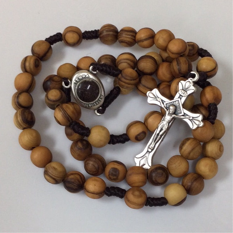 A genuine olive wood rosary with a small medal of Our Lady of Tenderness with soil from Jerusalem and is available in a variety of sizes with or without a clasp. This rosary comes all the way from the Holy Land and is brought by Mother Adela, Foundress SCTJM, when she leads pilgrimages. Our Lady of Tenderness reminds us of the tender love a mother has for her child and the love that a child has for his mother. Our Lady is a mother to us all and this rosary draws us to her maternal love and peace as we seek her maternal embrace. This rosary, coming from the land where Our Lord lived and died, is perfect as a gift or for yourself to offer prayers for your family, your friends, and the entire world.