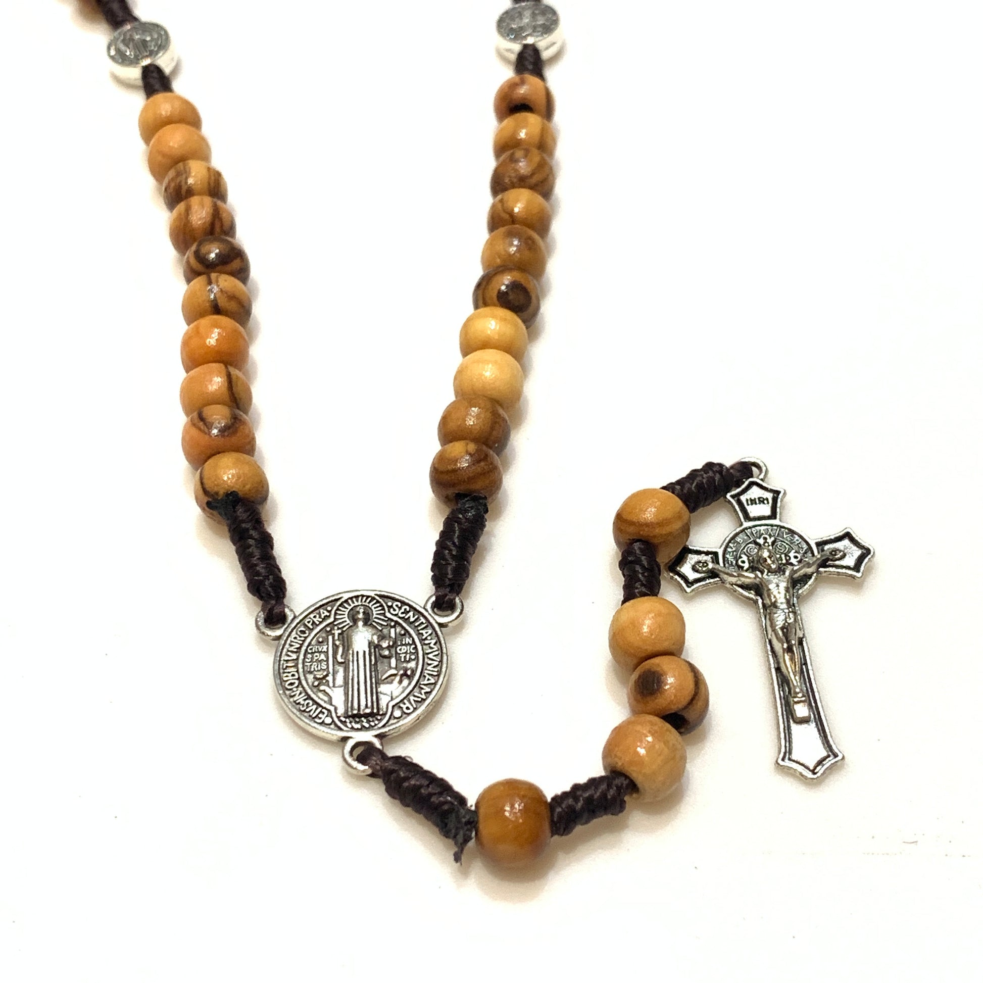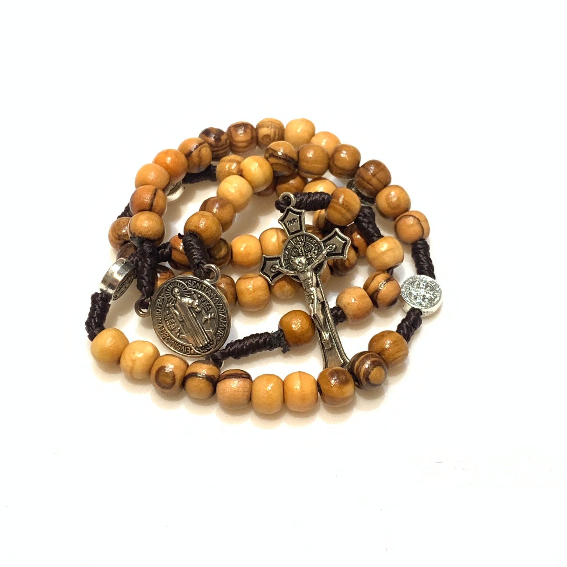 A genuine olive wood rosary with Saint Benedict medals as the Our Father beads and a St. Benedict crucifix. This rosary comes all the way from the Holy Land and is brought by Mother Adela, Foundress SCTJM, when she leads pilgrimages. Uniting St. Benedict with the heart of Our Lady, the prayers offered from this rosary bring many graces for those praying and being prayer for. This rosary, coming from the land where Our Lord lived and died, is perfect as a gift or for yourself to offer prayers for your family, your friends, and the entire world.
