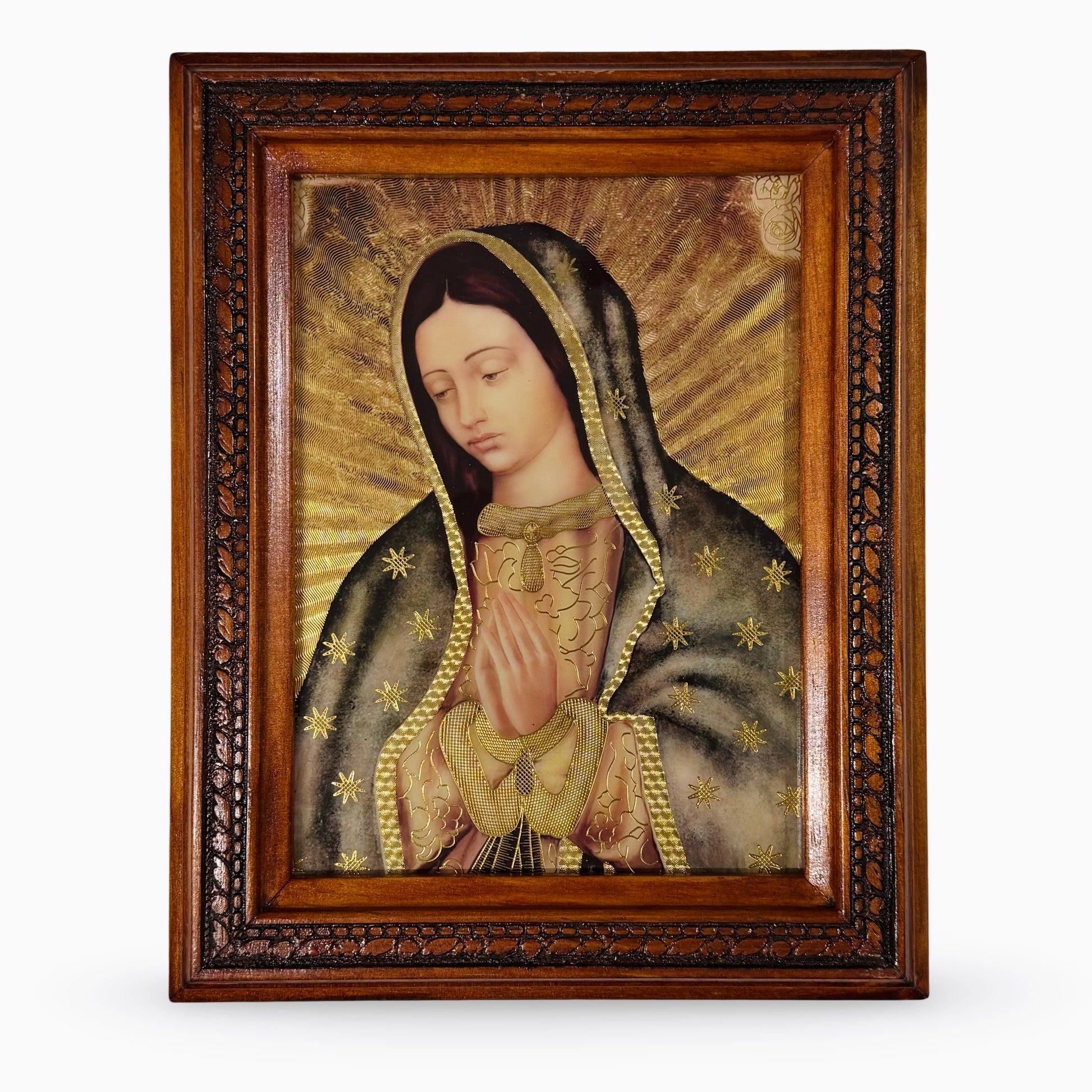 Add a touch of classic and detailed charm to your home with Our Lady of Guadalupe wooden frame. Crafted from wood and intricately carved, this frame showcases the beautiful image of Our Lady. Perfect traditional decor to cover your home under Our Lady's Mantle.