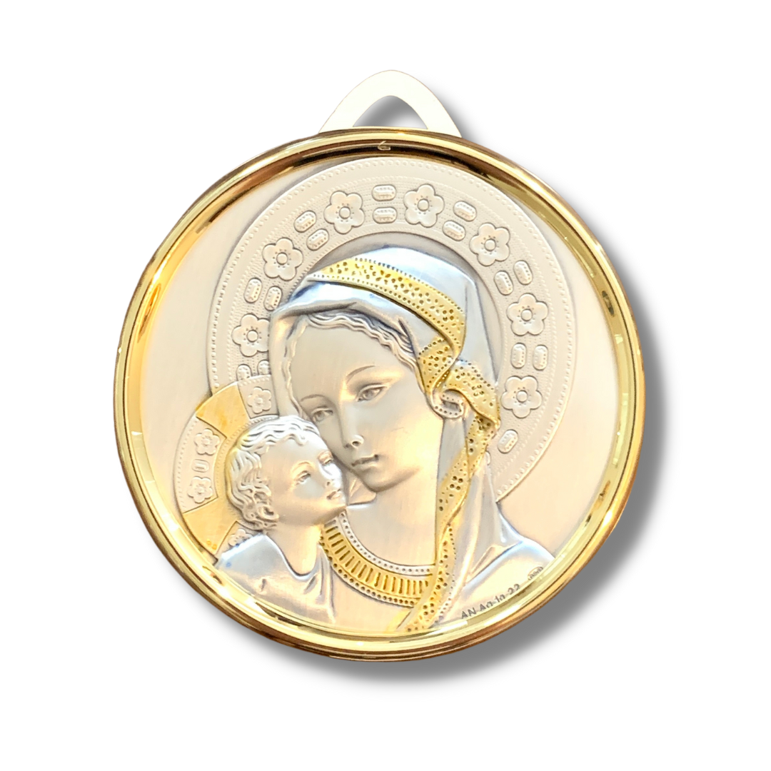 A silver crib medallion of Our Lady of Tenderness is an elegant addition to any nursery, bringing a beautifully Marian presence along with it! This product is brought with love by our Sisters serving the Heart of the Church in Rome, Italy!