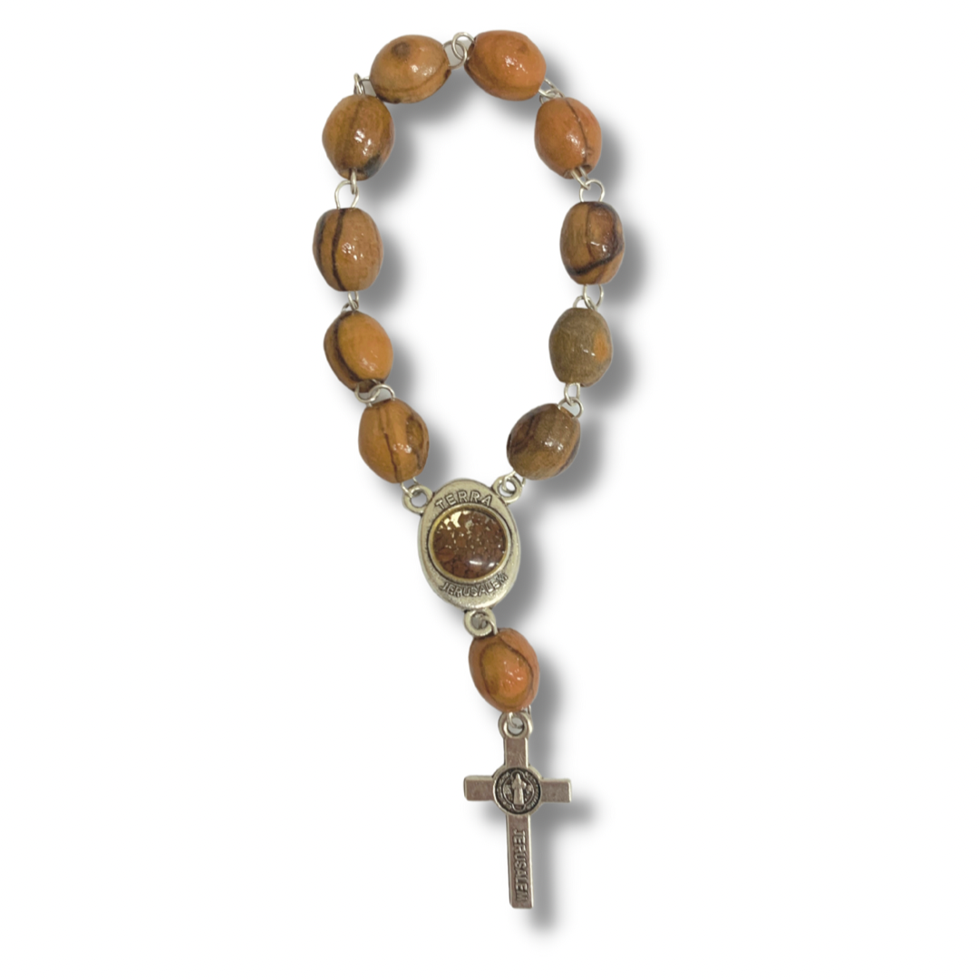 A genuine olive wood decade rosary with medal links and a small medal of Our Lady of Tenderness with soil from Jerusalem and a St. Benedict cross. This decade rosary also includes a Holy Card from the Holy Land which includes pieces of wood from Gethsemane and flower petals from the Holy Land. Our Lady of Tenderness reminds us of the tender love a mother has for her child and the love that a child has for his mother. Our Lady is a mother to us all and this decade rosary draws us to her maternal love and peace as we seek her maternal embrace. This decade rosary, coming from the land where Our Lord lived and died, is perfect as a gift or for yourself to offer prayers for your family, your friends, and the entire world. This rosary comes all the way from the Holy Land and is brought by Mother Adela, Foundress SCTJM, when she leads pilgrimages.