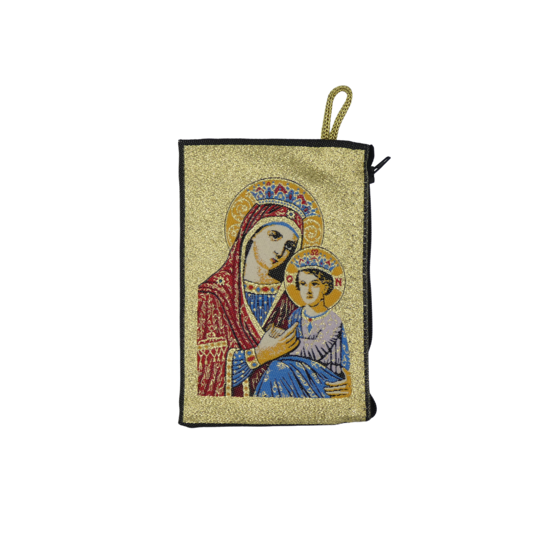 This pouch features an iconographic image of Our Lady dressed in a red mantle, representing her humanity, and the Child Jesus wearing purple, representing His royalty, and wrapped in blue, representing His Divinity. As the Mother of Jesus, the King of all creation, Our Lady is given the title of "Queen" and as we pray in the 5th Glorious Mystery of the rosary, she is the Queen of Heaven and Earth. This pouch is perfect for holding prayer cards, rosaries, and other small devotional items. It fits well in a purse or can be used as a small handheld wallet to proclaim Our Lady's Queenship to others.