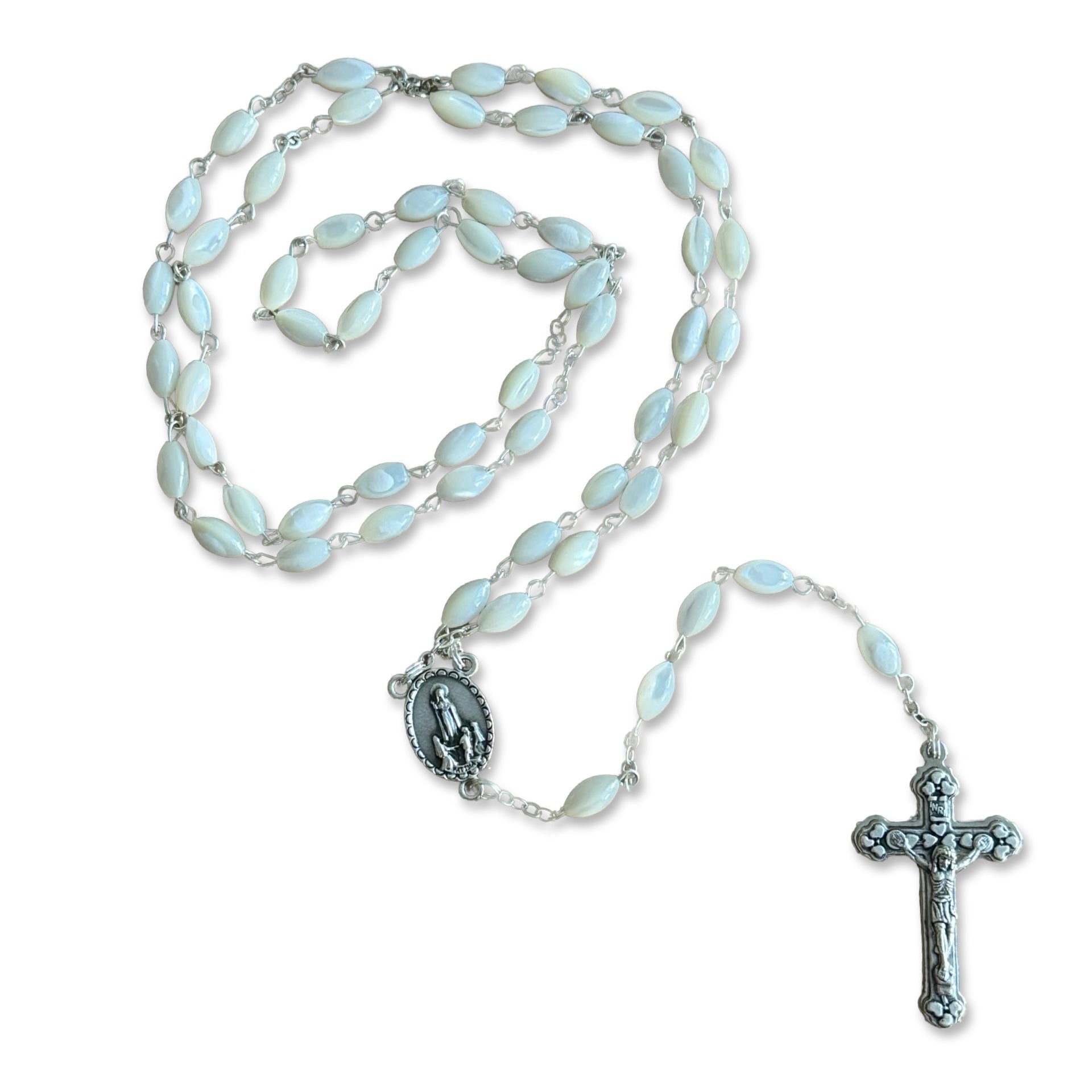 Oval Mother of Pearl Fatima Rosary with Heart Embellished Crucifix