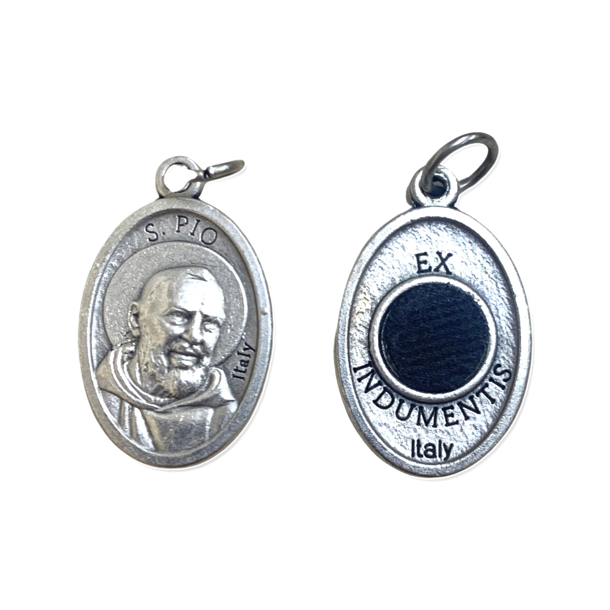 This double-sided medal of St. Padre Pio bears an image of St. Padre Pio, as well as a second-class relic of Padre Pio. This item is a perfect addition to any rosary or necklace as a constant assurance of his spiritual guidance. This product is brought with love by our Sisters serving the Heart of the Church in Rome, Italy!