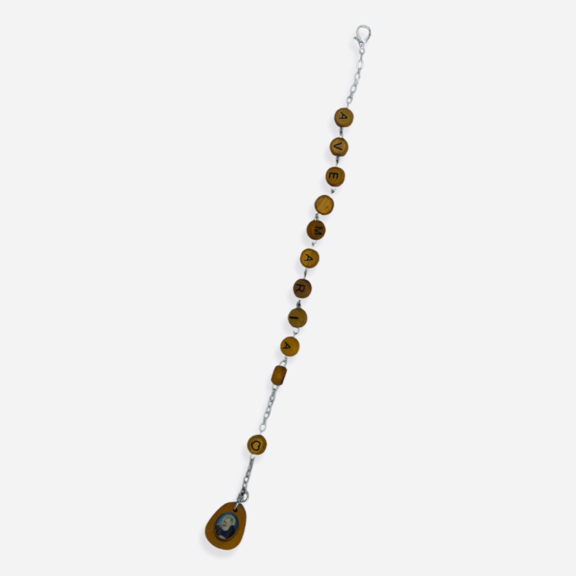 This decade rosary comes all the way from San Giovanni Rotondo. The wooden beads spell out "AVE MARIA" and are linked together with metal links with an image of St. Padre Pio at the end. This decade comes with a Holy Card and includes a clasp so it can can either be worn as a bracelet, hung from a car mirror, or attached to a zipper to unite the spiritual power of Our Lady and St. Padre Pio. This product is brought with love by our Sisters serving the Heart of the Church in Rome, Italy!