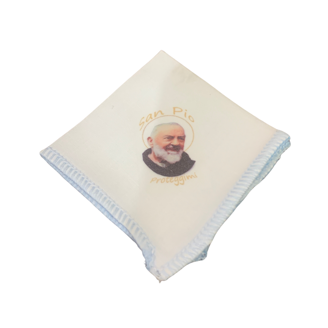 This small handkerchief of St. Padre Pio is brought all the way from the city where the saint lived, San Giovanni Rotondo. In the center there is a portrait photo of the saint. The edges are sewn with three different colors; blue, white, and pink.