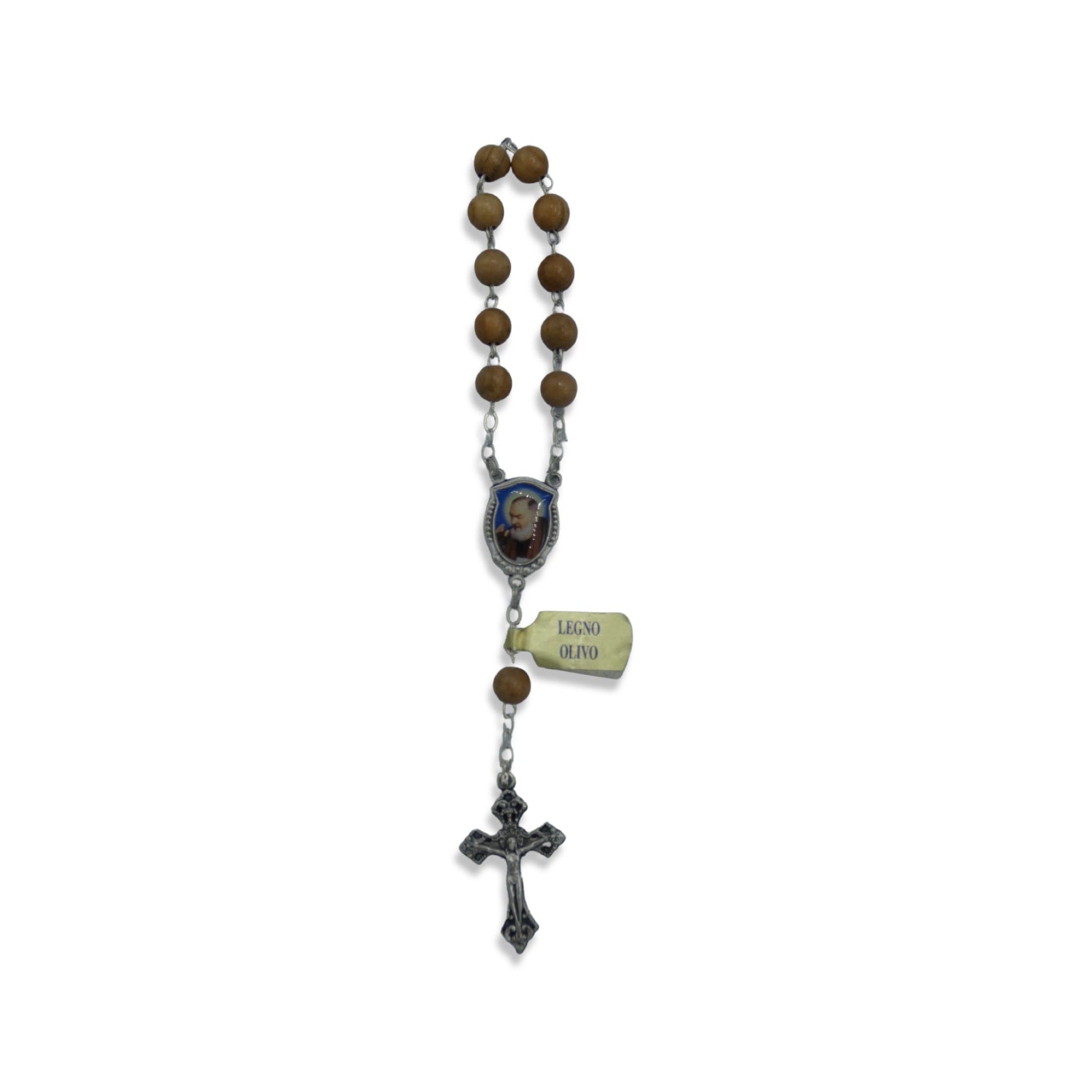 This decade rosary comes all the way from San Giovanni Rotondo and is available with olive wood or regular wood. The wooden beads are linked together with metal links with a colored image of St. Padre Pio with a second-class relic as the Our Father bead. This decade comes with a wooden crucifix with a metal reinforced back and unites the spiritual power of Our Lady and St. Padre Pio. This product is brought with love by our Sisters serving the Heart of the Church in San Giovanni Rotondo, Italy!