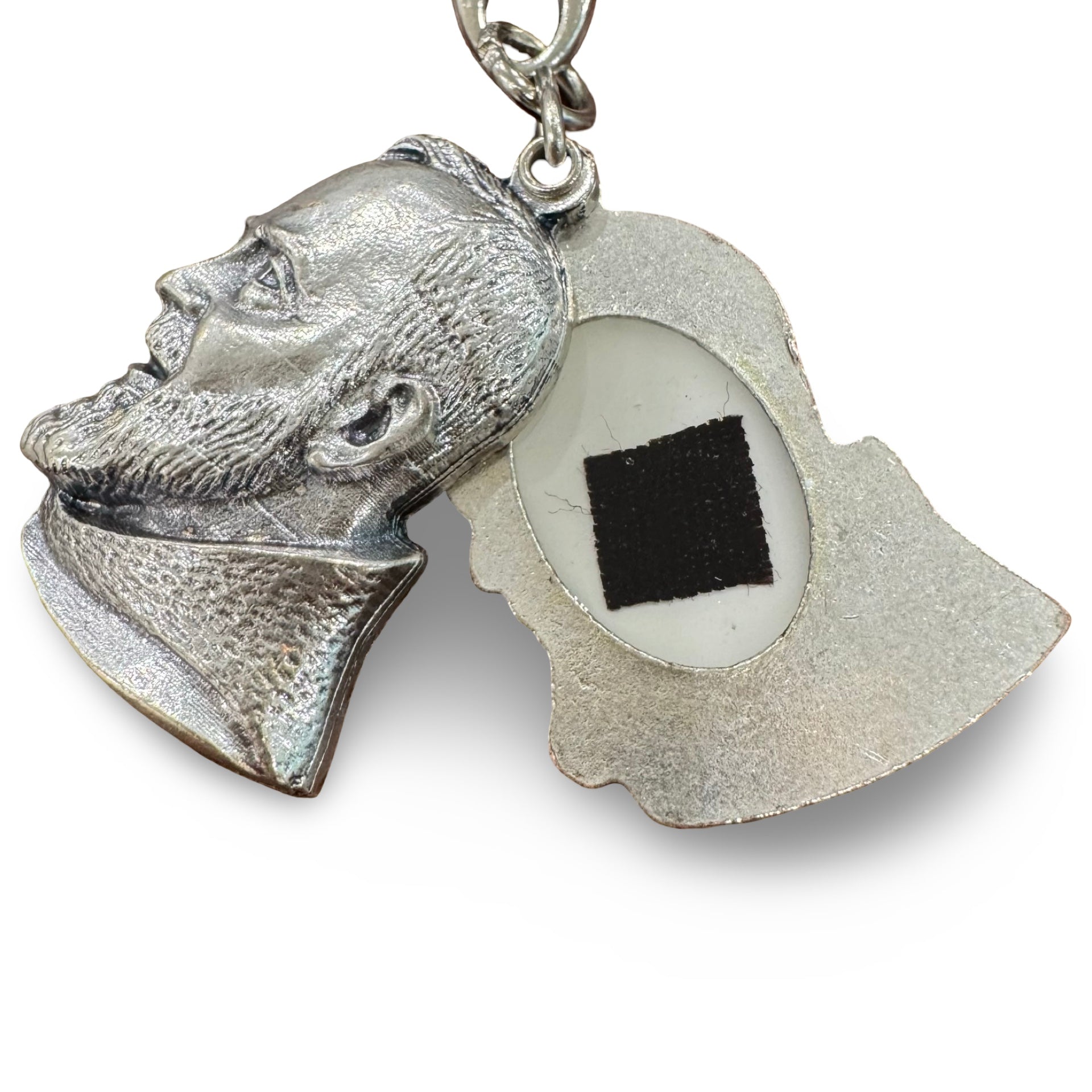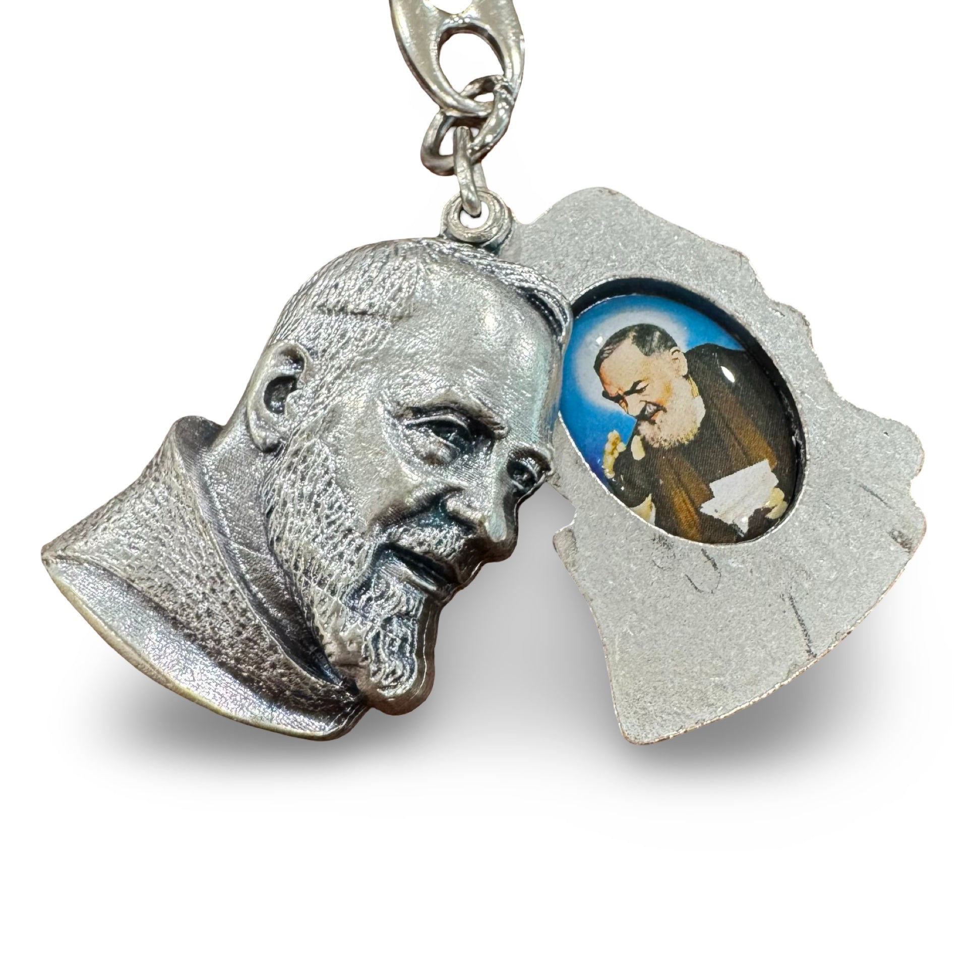 Carry the powerful spiritual presence of St. Padre Pio with you always, as this item is a great accessory to keys, backpacks, and zippered pouches! The bust of Padre Pio slides open to reveal a colored image of him on one side, and a relic on the other. This keychain is a special memento of San Giovanni Rotondo, the city where he served until his death in 1968. This product is brought with love by our Mother Foundress, Mother Adela Galindo, SCTJM during a pilgrimage to San Giovanni Rotondo.