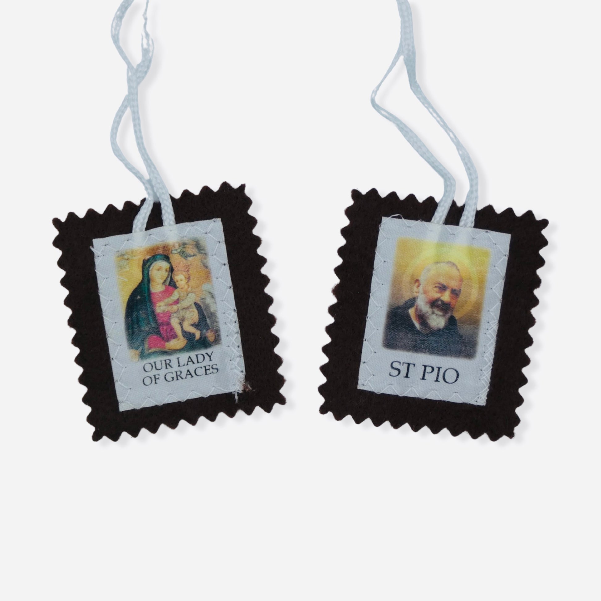 This scapular features images of St. Padre Pio and Our Lady of Graces and is available in two sizes, making this ideal for anybody desiring to show their devotion to the Lord! Scapulars are a powerful sacramental and have been used by faithful Catholics since the 13th century, after Our Lady appeared to St. Simon Stock and revealed the scapular to him.
