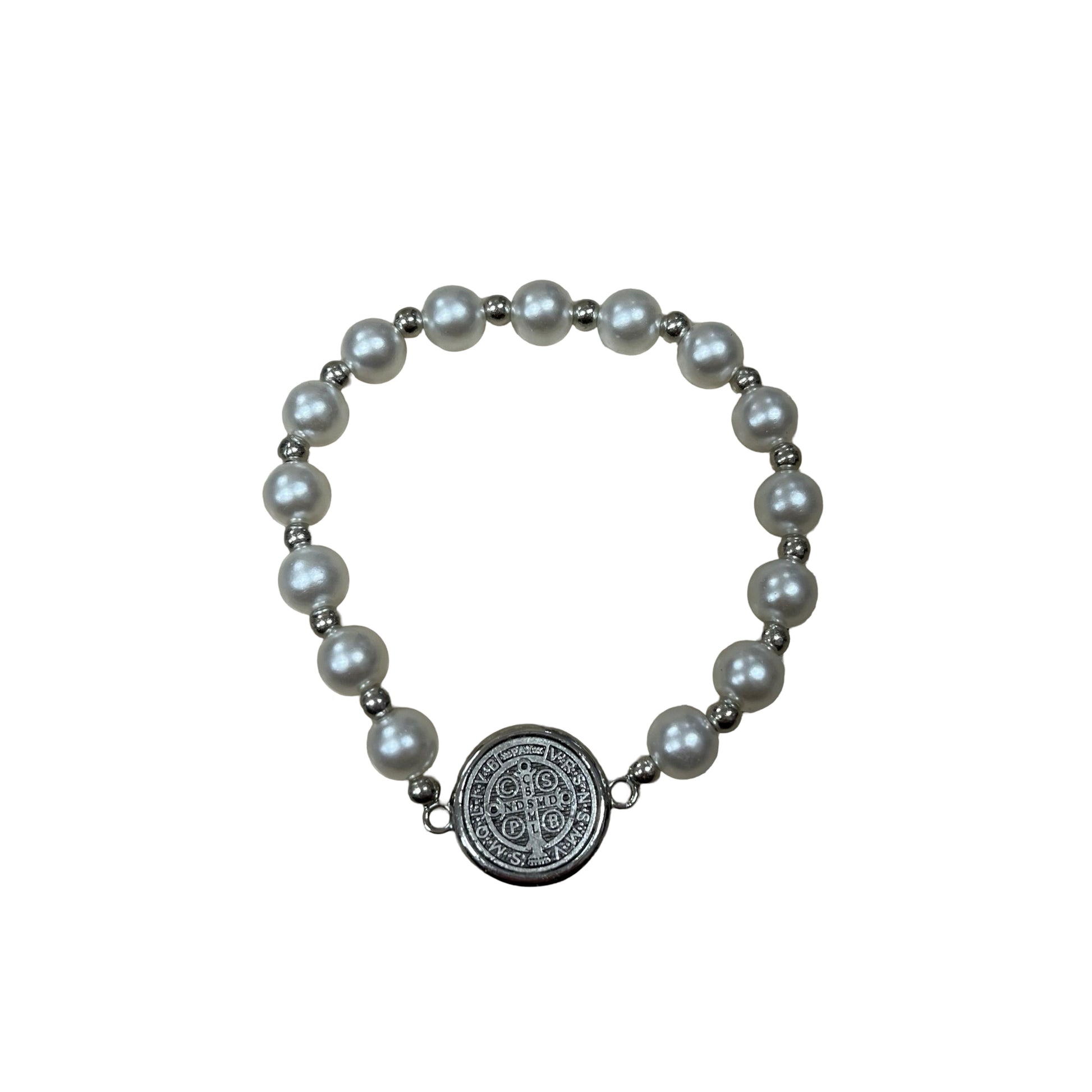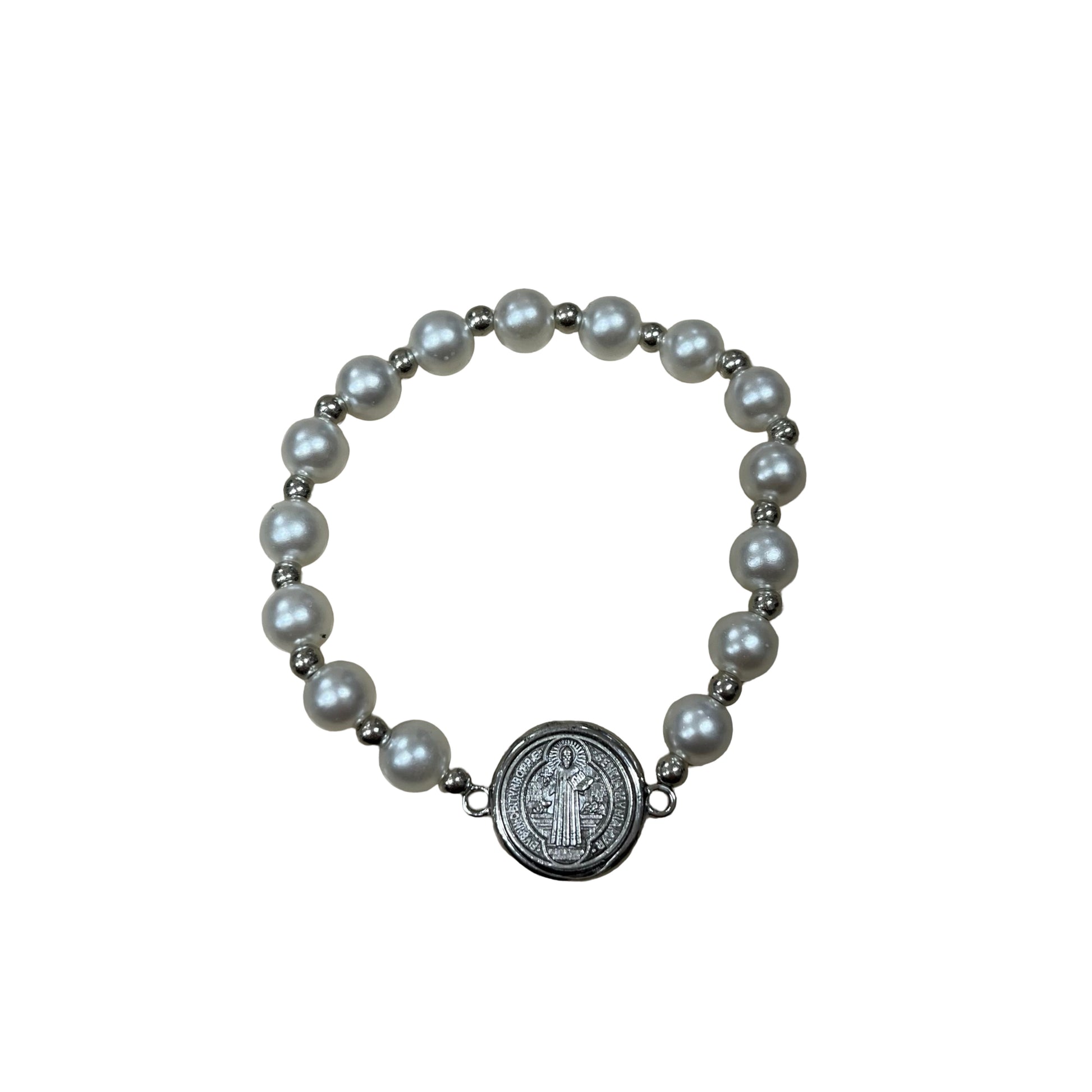 This pearl and silver beaded bracelet is a stylish way to wear your St. Benedict Medal. Enhance your wardrobe and benefit from the protection of the powerful sacramental.