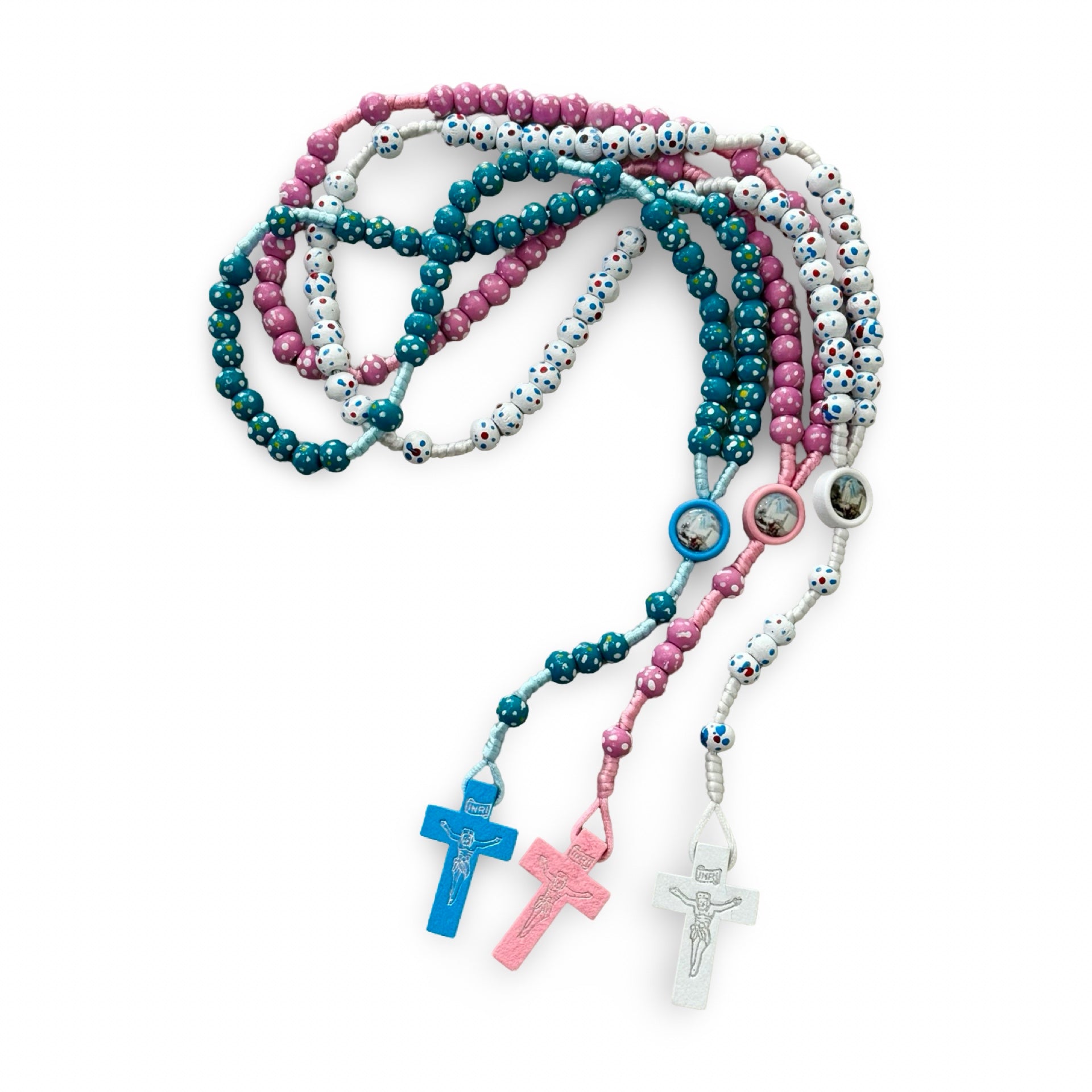 These beautiful children's rosary necklaces were brought from Fatima and feature polka dot painted beads with a colored, center medal of Our Lady of Fatima. Like Lucia, Francisco and Jacinta, may all children respond with generous hearts to the call of Our Lady of Fatima to pray the rosary.