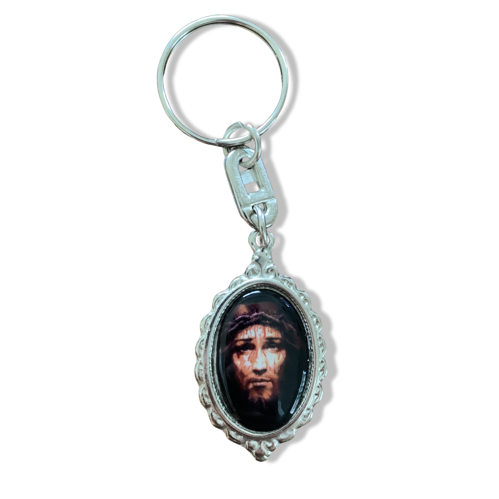 This Precious Blood Keychain features a beautiful design with the face of Jesus on one side and an image of the Crucifixion on the other.