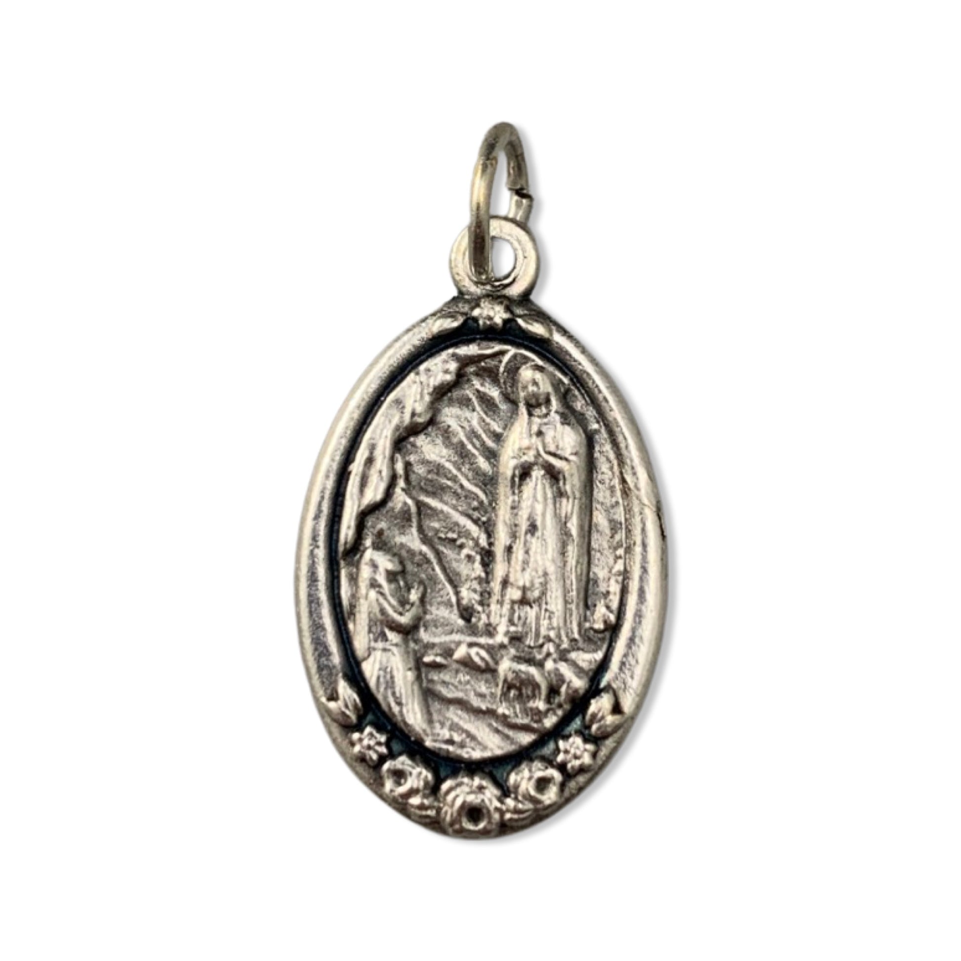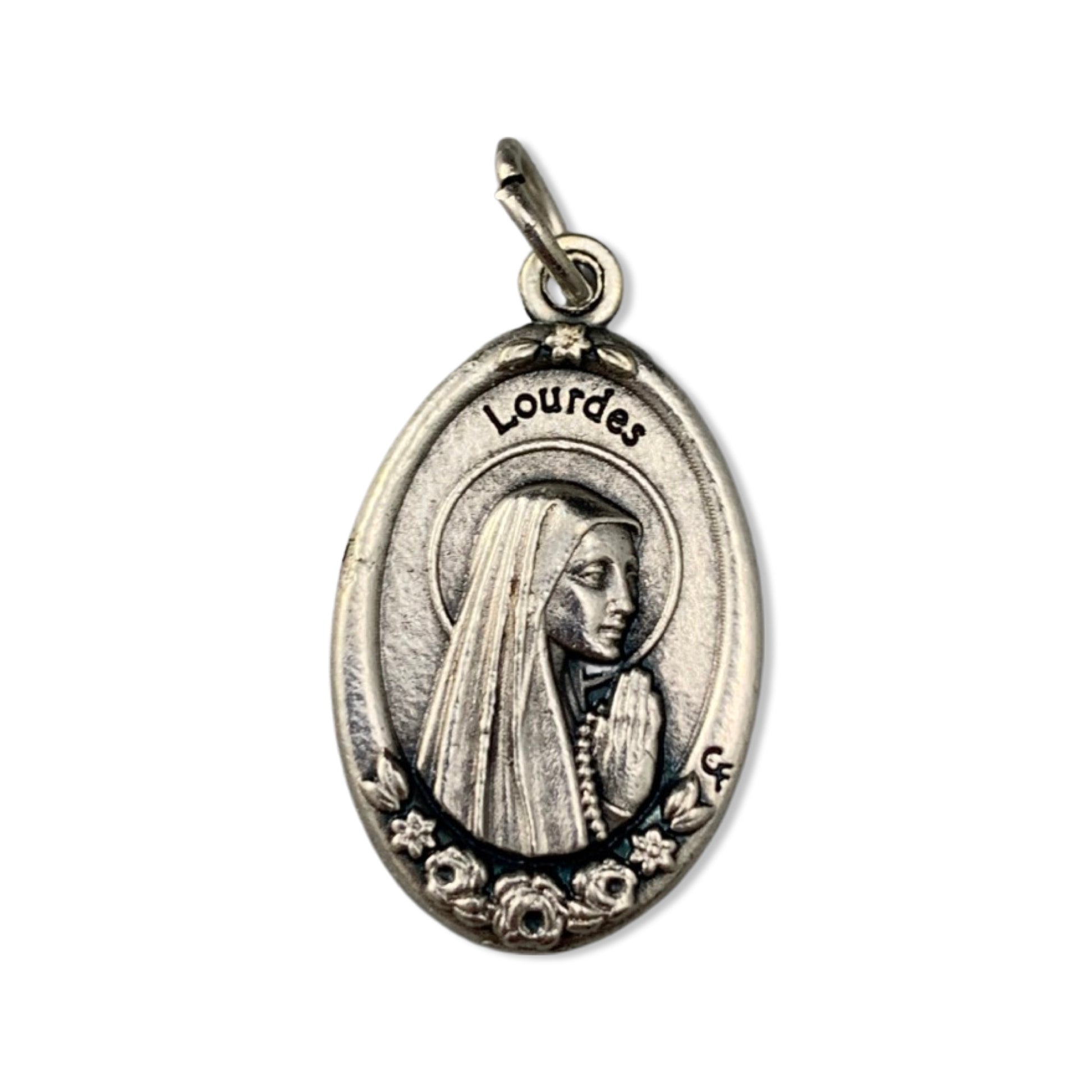 This double-sided medal of Our Lady of Lourdes bears an image of Our Lady, as well as a scene of Her apparition to St. Bernadette. This item is a beautiful reminder of Our Lady's healing presence in one's life. It is perfect to use as a pendant or to add to a rosary. This product is brought with love by our Sister on pilgrimages to Lourdes, France.