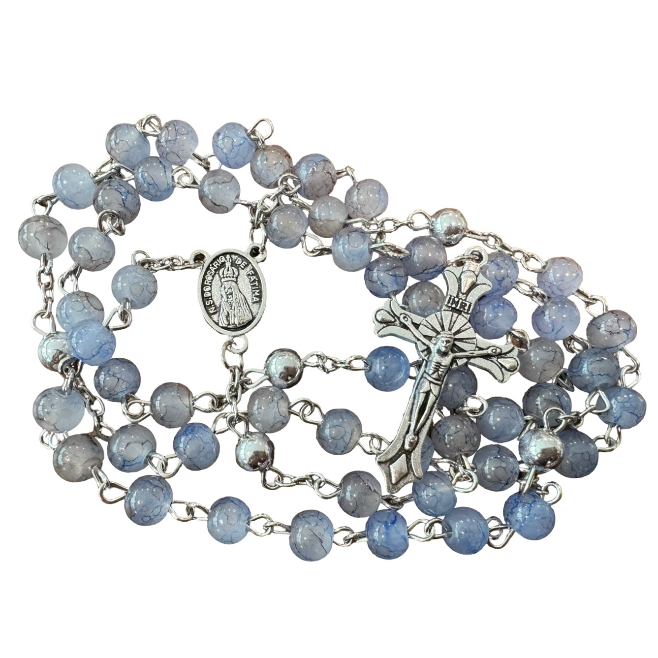 This rosary has a cloudy and marbled blue gray color. A wonderful feature of the rosary is that the center medal which features an image of our Lady of Fatima, contains soil from the holy site. This rosary would make a wonderful gift for a person that is unable to go physically to the site of the apparitions, so that they can share in a way the graces that come from this graced land.