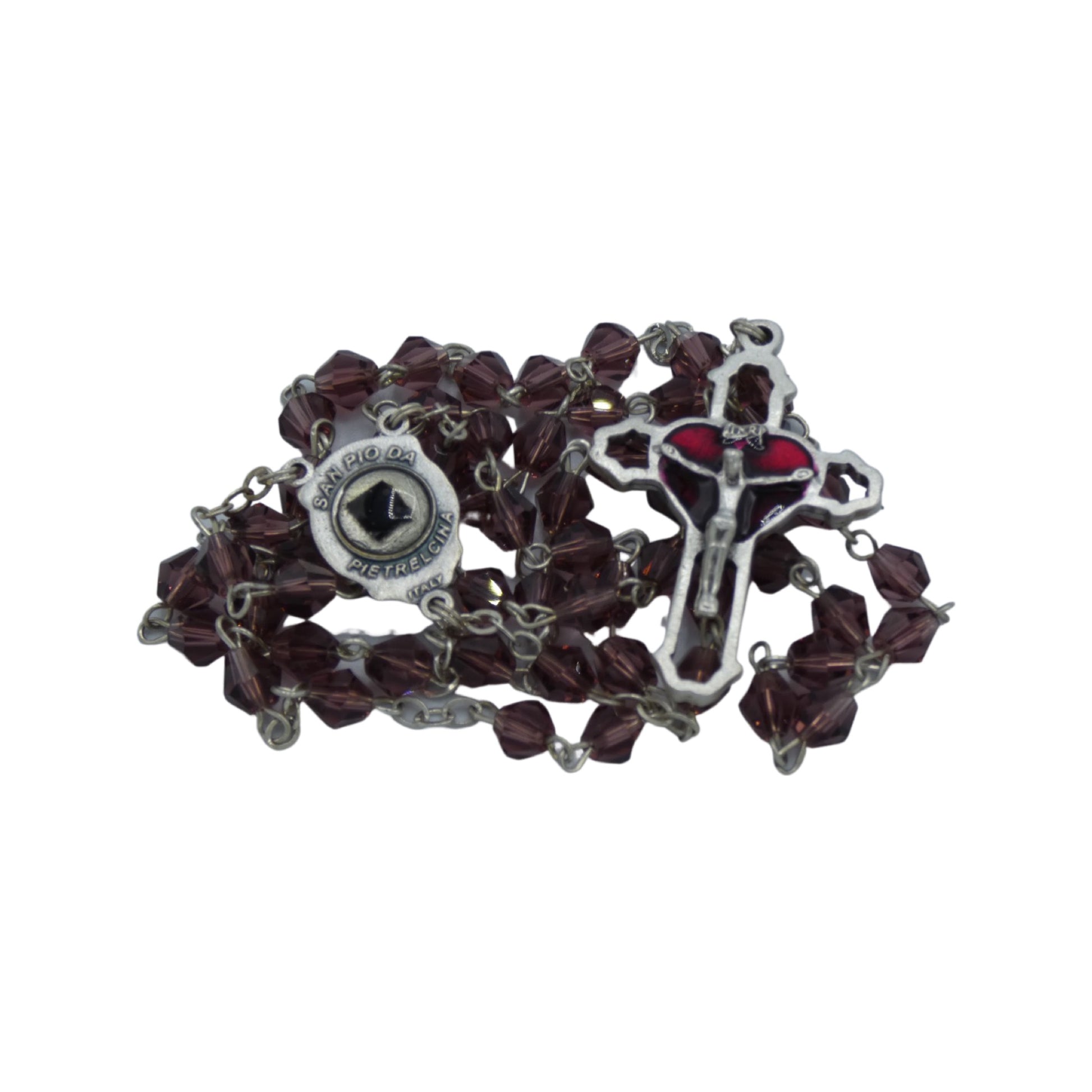 This rosary comes all the way from San Giovanni Rotondo and is made of purple beads with metal links. The Our Father bead is a colored medal of St. Padre Pio with a second-class relic. This rosary comes with a metal crucifix with a heart-shaped center and unites the spiritual power of Our Lady and St. Padre Pio and is a perfect gift for any Padre Pio fans you know or as a personal rosary! This product is brought with love by our Sisters serving the Heart of the Church in Rome, Italy!