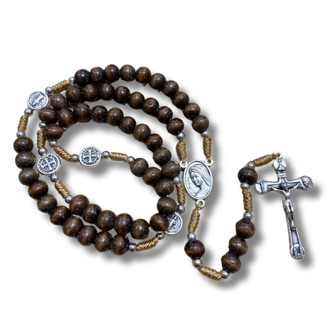 This sacramental rosary features wooden beads and detailed medals. The back of the crucifix is adorned with the words "Mir, Mir, Mir" translating to "peace."