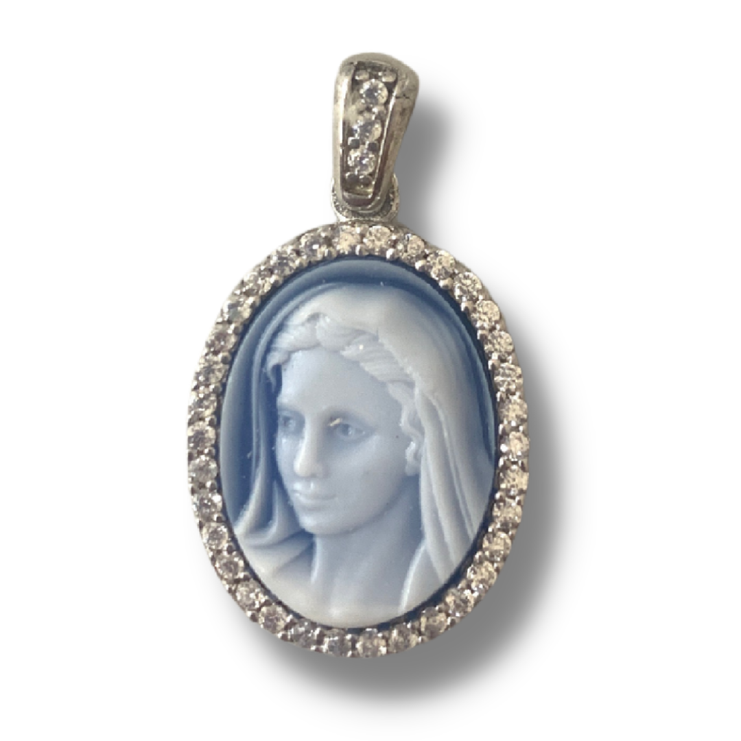 Queen of Peace Cameo Medal with Diamond Border and Hoop