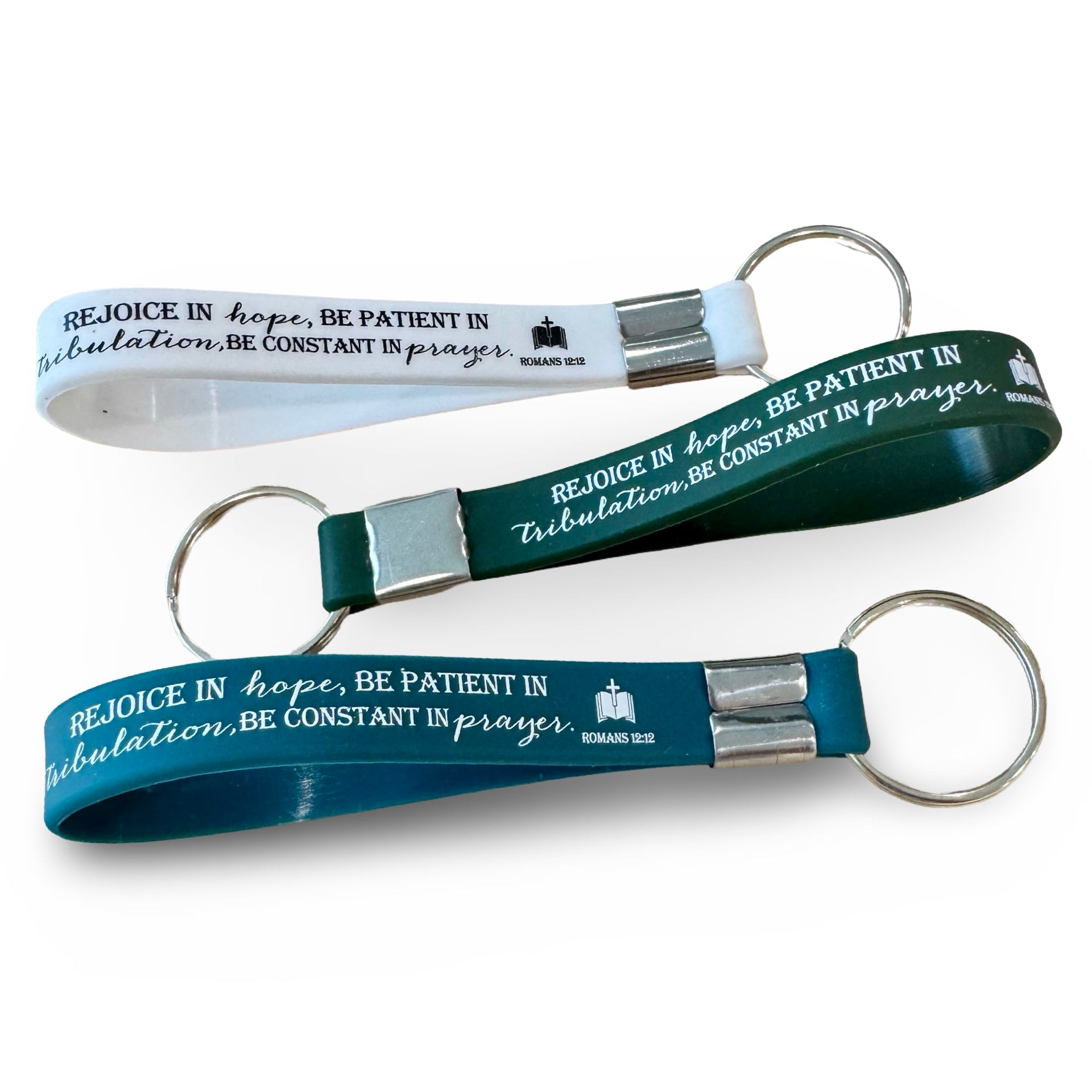 These silicone keychains have the Scripture verse Romans 12:12 and come in assorted colors. Add your keys and read the Scripture verse as a reminder every time you leave the house.