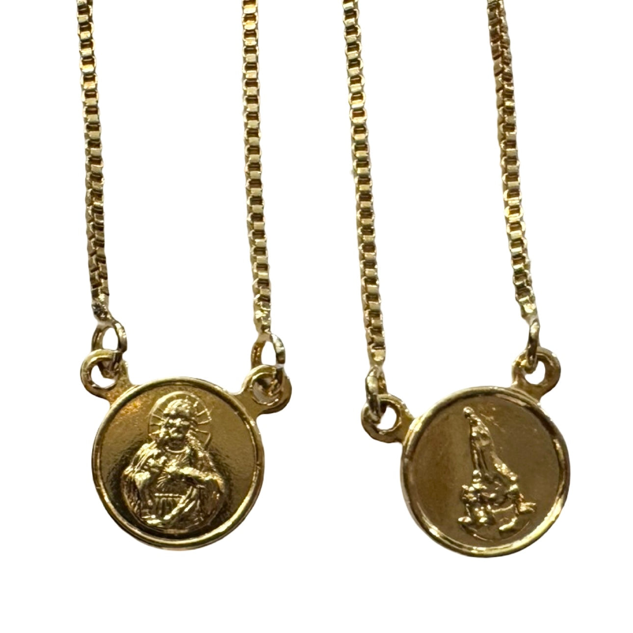 This round, gold-colored scapular honors Our Lady of Fatima, serving as a meaningful sacramental for personal devotion. Unite your heart with the Heart of Our Lady by wearing the this sacramental She entrusted to Her children.