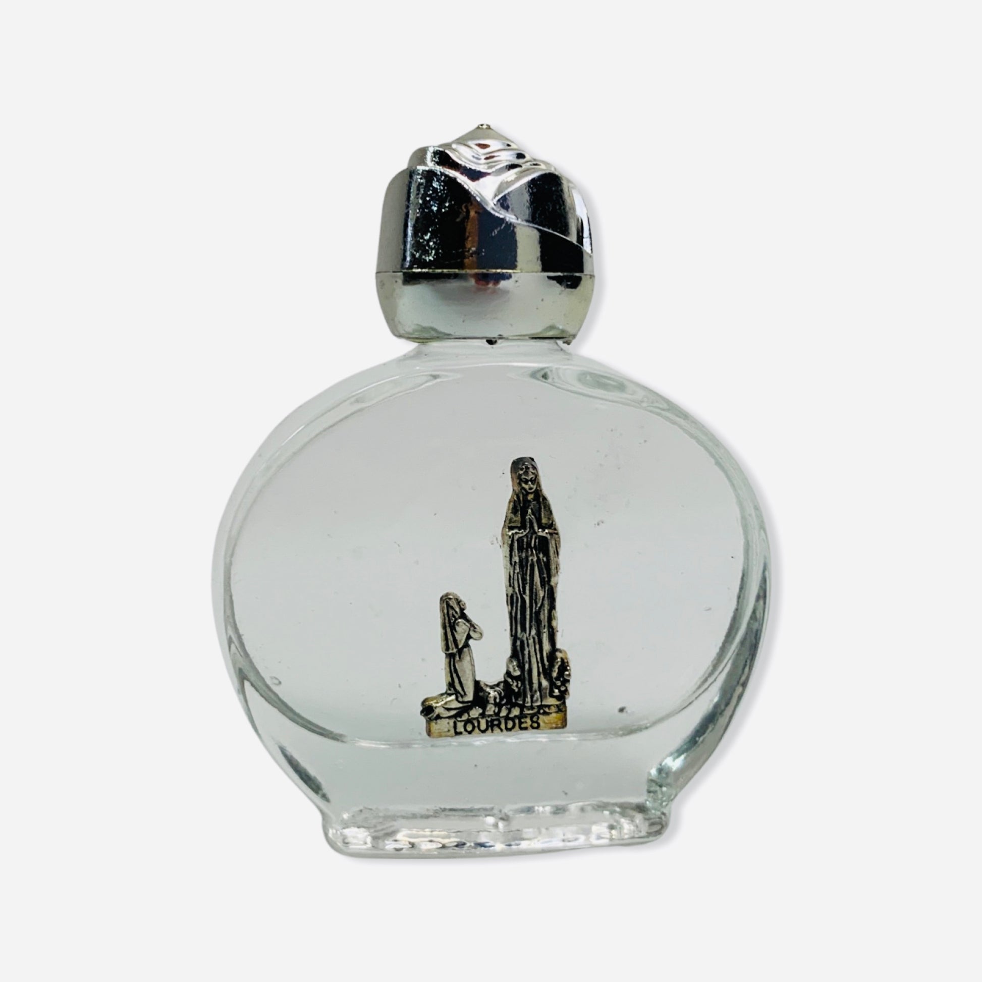 A round Lourdes glass holy water bottle is a perfect way to keep holy water or miraculous water from Lourdes. The beautiful metal image of Our Lady of Lourdes with St. Bernadette makes this a simple reminder of the Grotto of Lourdes. This glass bottle is small enough to fit in a purse or bag and bring with you anywhere you go! This product is brought with love by our Sisters on pilgrimages to Lourdes, France.