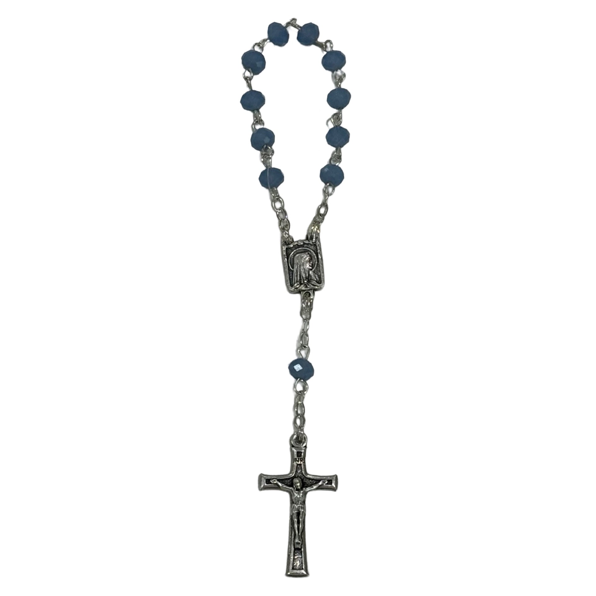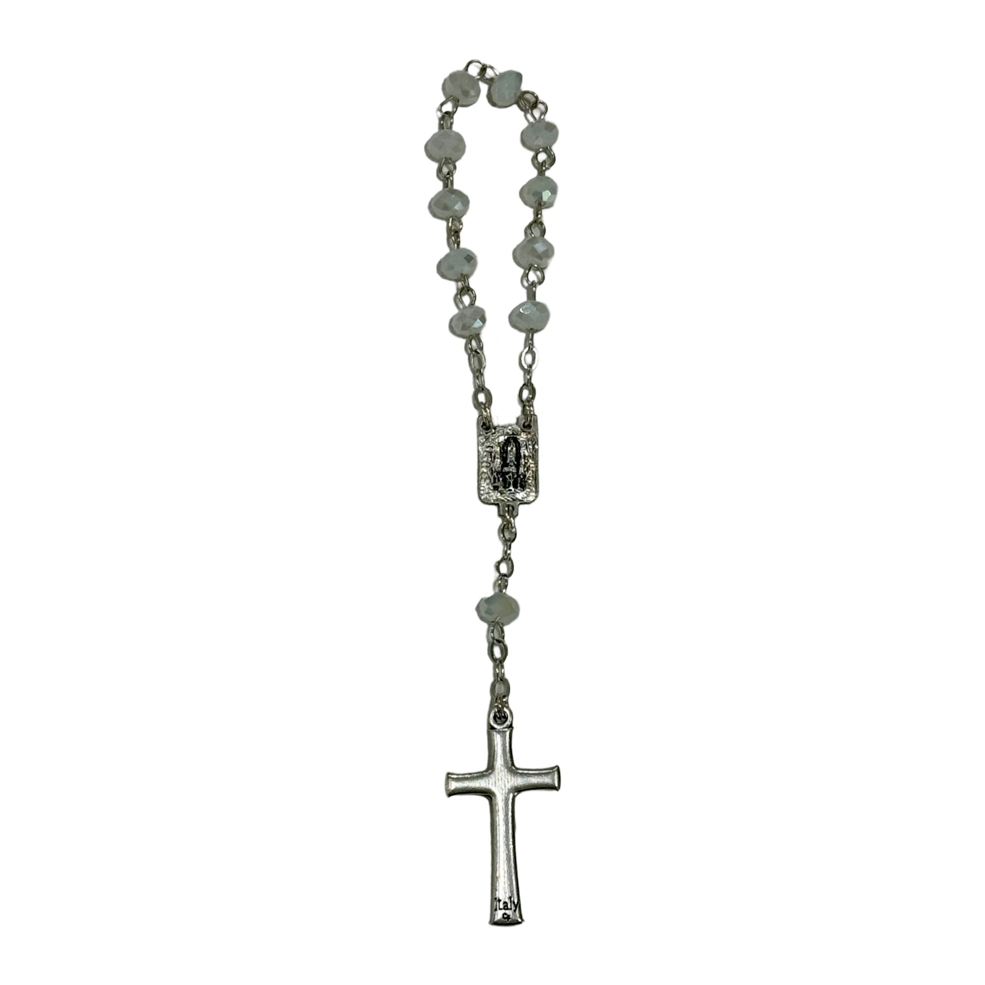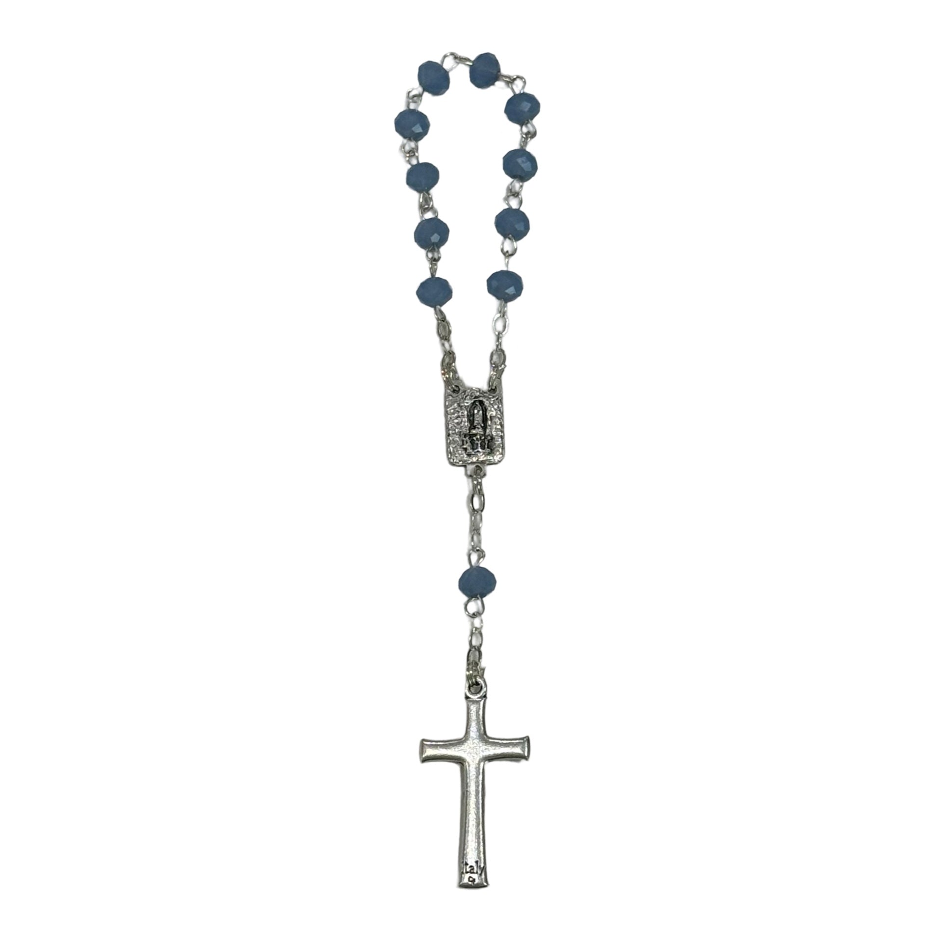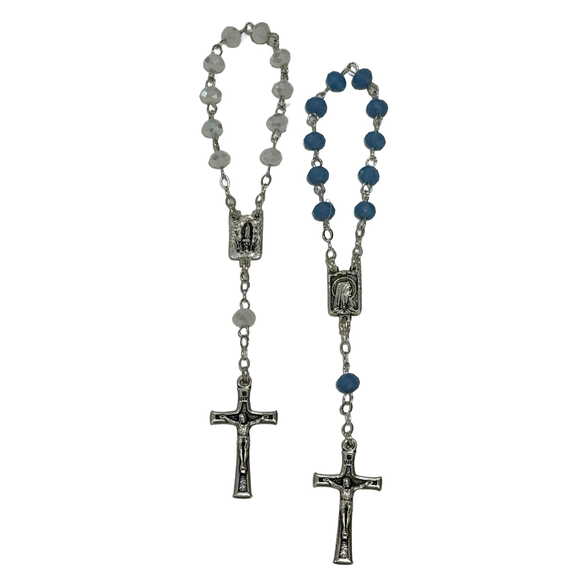 This decade rosary was brought from Lourdes and features Crystal beads in white or blue with a center medal of Our Lady of Lourdes and St. Bernadette. It comes with a holy card.