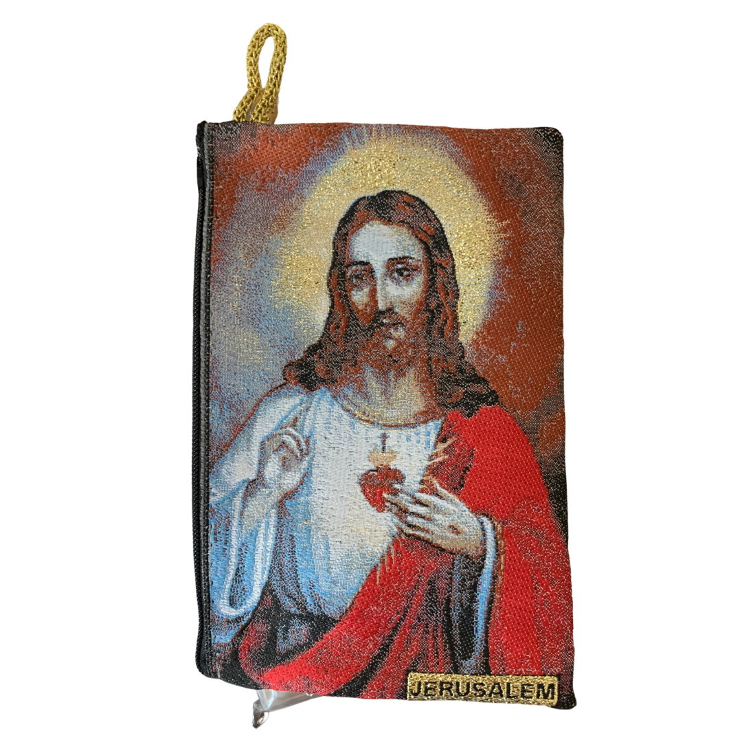 This Sacred Heart of Jesus pouch is perfect for holding prayer cards, rosaries, and other small devotional items. It fits well in a purse or can be used as a small handheld wallet. It bears the image of Our Lord with His Sacred Heart on a gold background.
