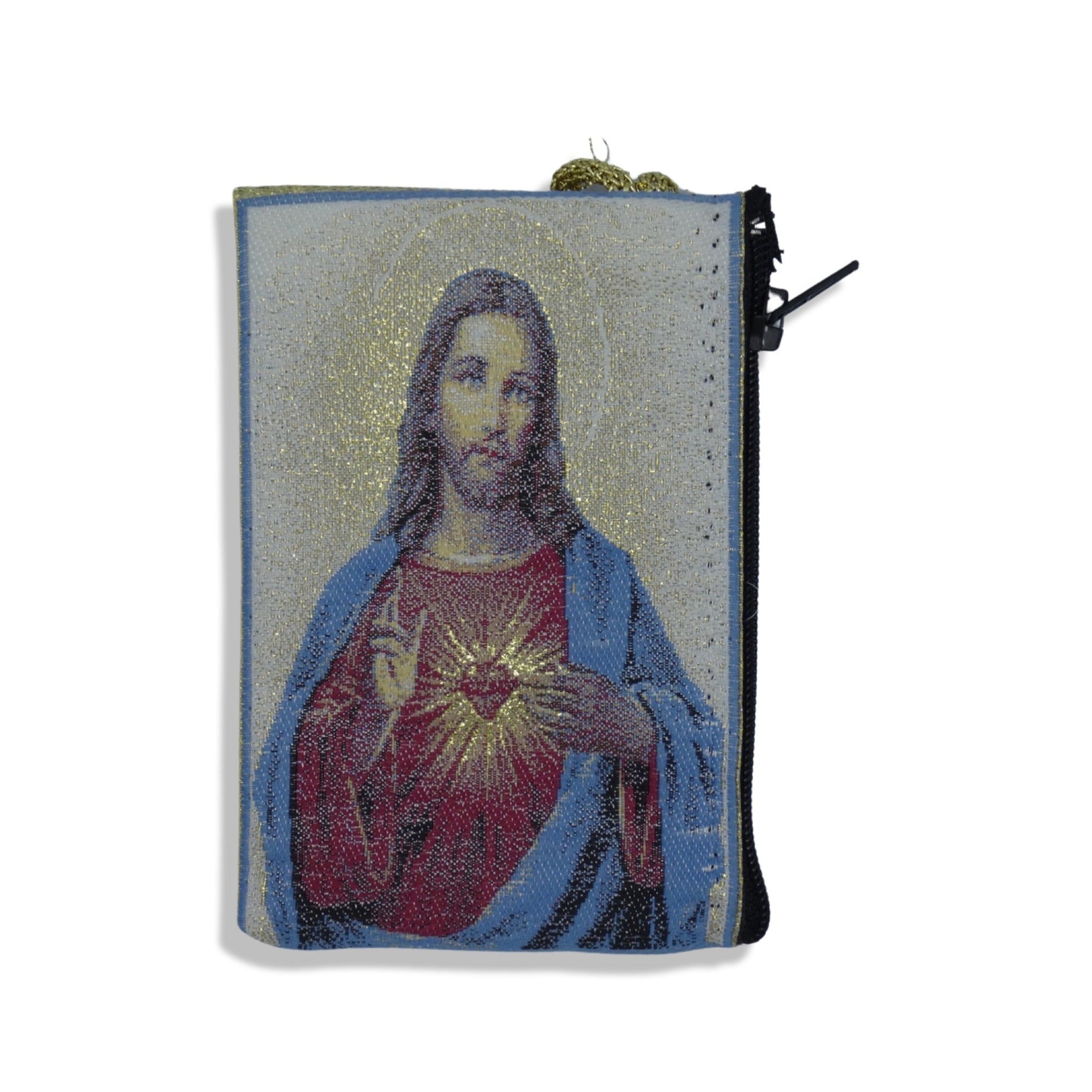 This Sacred Heart of Jesus pouch is perfect for holding prayer cards, rosaries, and other small devotional items. It fits well in a purse or can be used as a small handheld wallet. It bears the image of Our Lord with His Sacred Heart on a gold background.