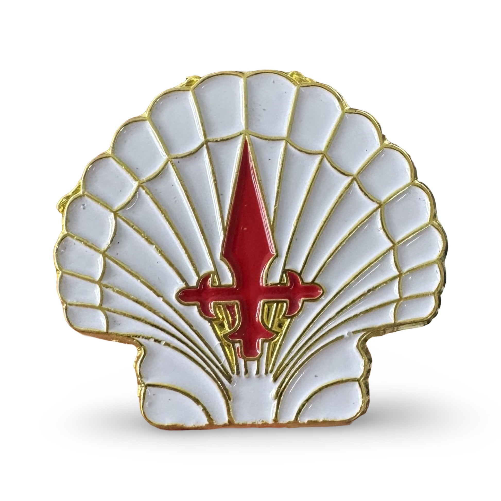 This pin with a shell and sword, a symbol of Santiago, is perfect to add to your backpack or bag.